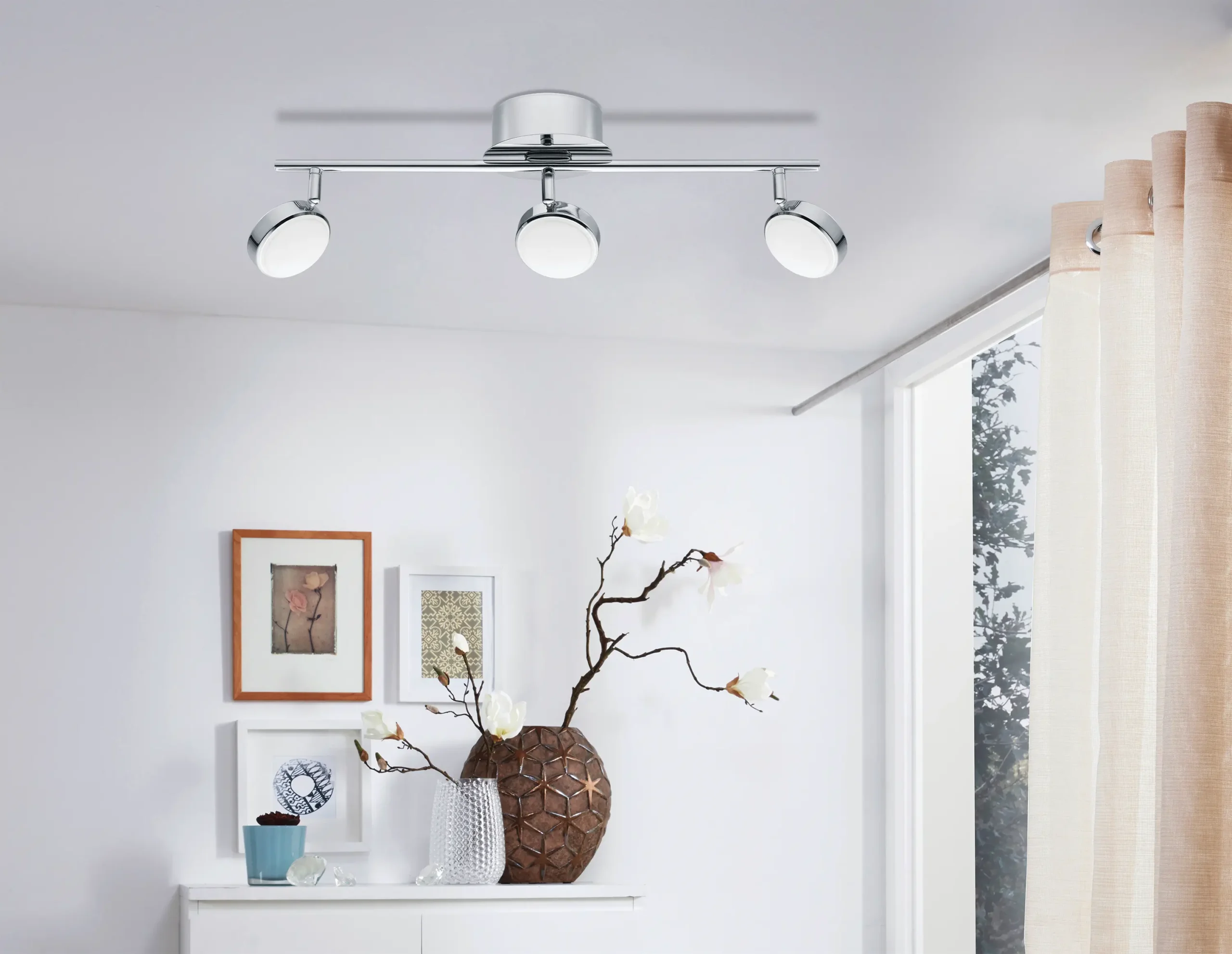 Modern Chrome Steel Design: Sleek steel construction in chrome finish with satin‑plastic diffusers for ambient lighting suitable for ceilings or walls.