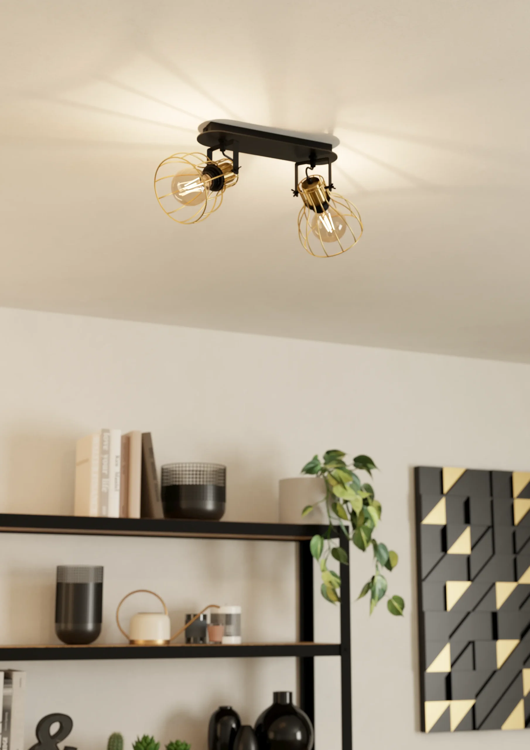 Stylish industrial‑Scandi hybrid – Features two openwork cage shades in brushed-brass finish mounted on a sleek black steel bar, delivering a minimalist yet eye-catching design that blends seamlessly into contemporary, mONOchrome, or industrial décor.
