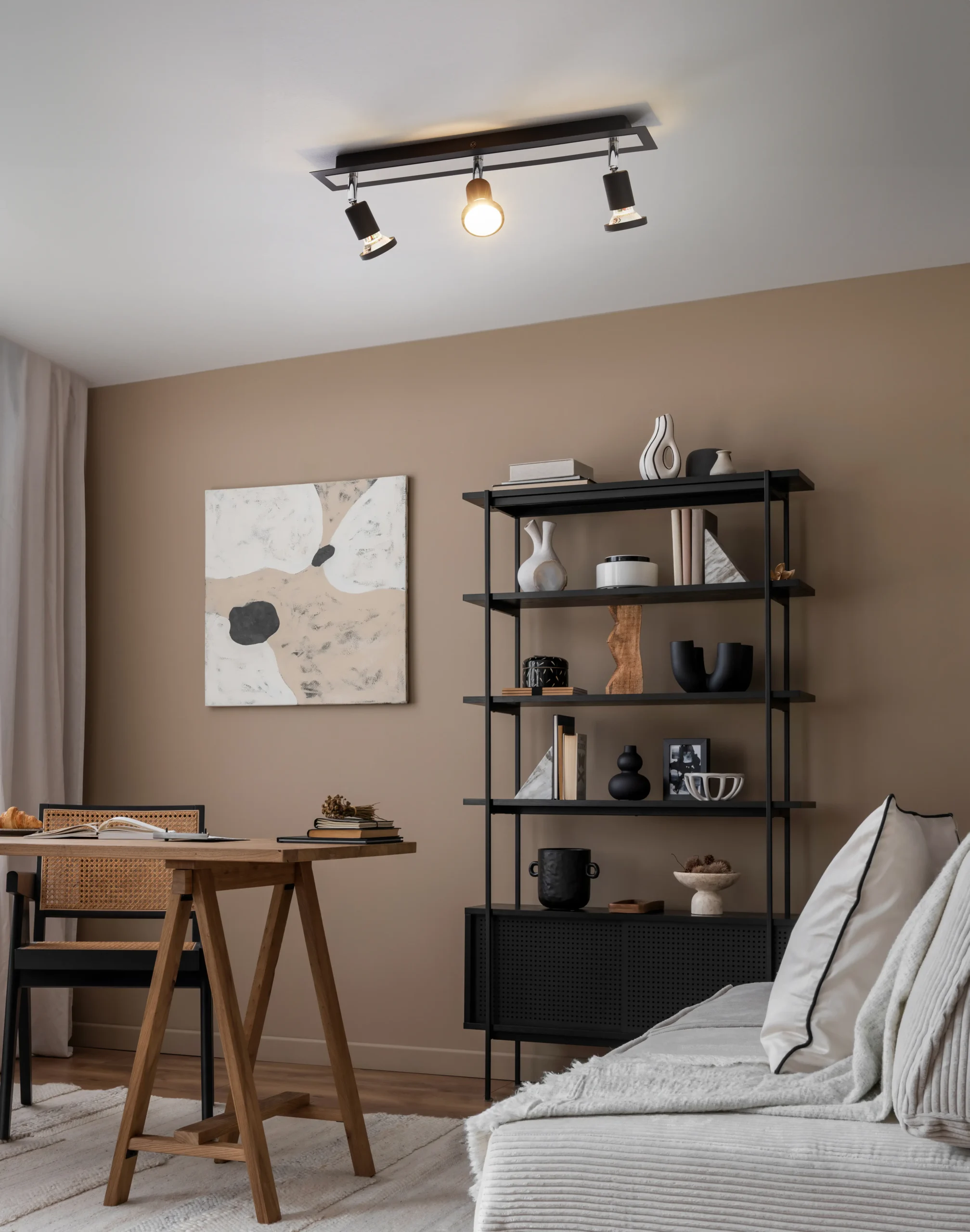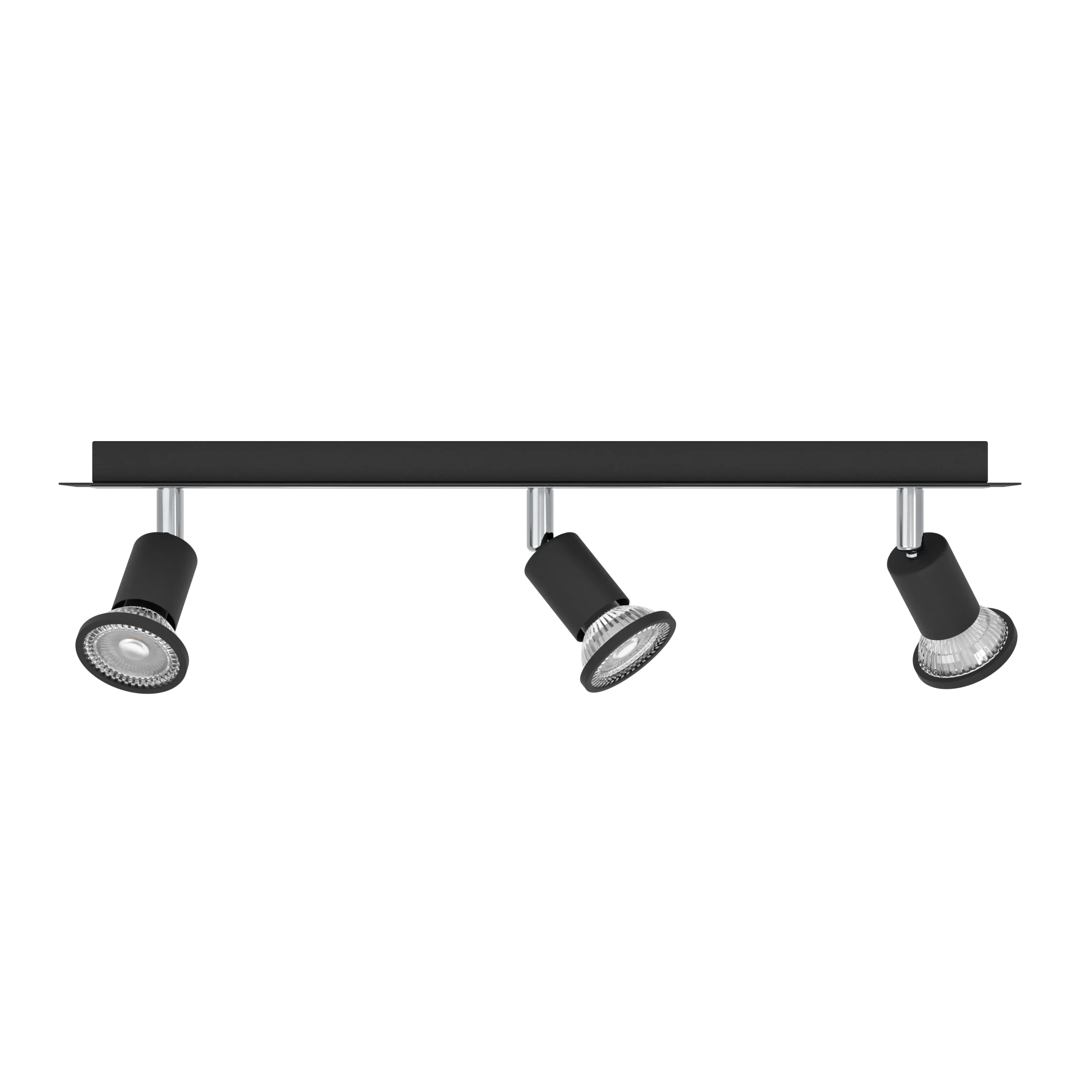 Flexible 3‑spot design – Features three adjustable swivel spotlights mounted on a sleek black steel bar with elegant chrome accents—perfect for accent lighting in living rooms, kitchens, hallways, or offices.