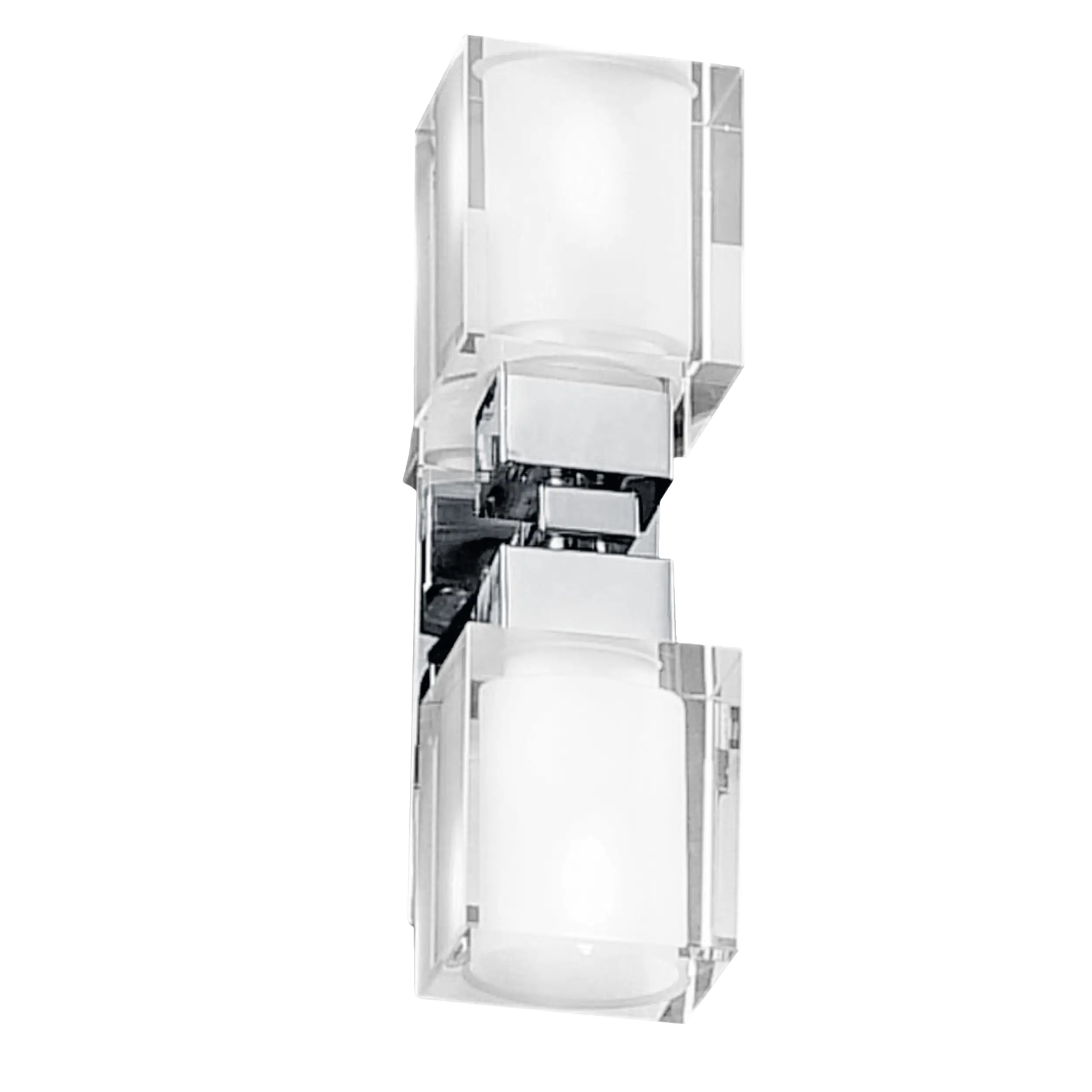 Stylish Chrome with Clear & Satin Crystal Shades – Features polished chrome steel with two genuine crystal-glass shades combining clear and satin finishes, offering elegant, softly diffused Lamping above vanities or in hallways.