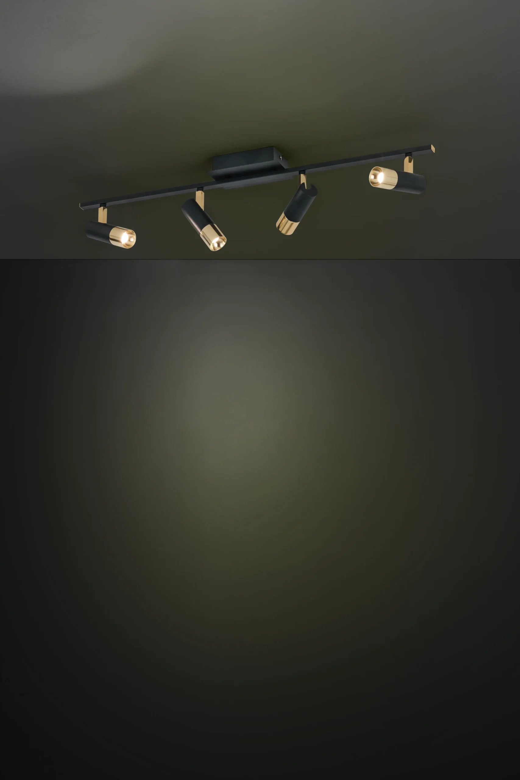 Elegant Adjustable SpotLamp Design – Four directional LED heads in a sleek black steel & brass‑accented aluminum bar, offering focused Lamping with versatile positioning.