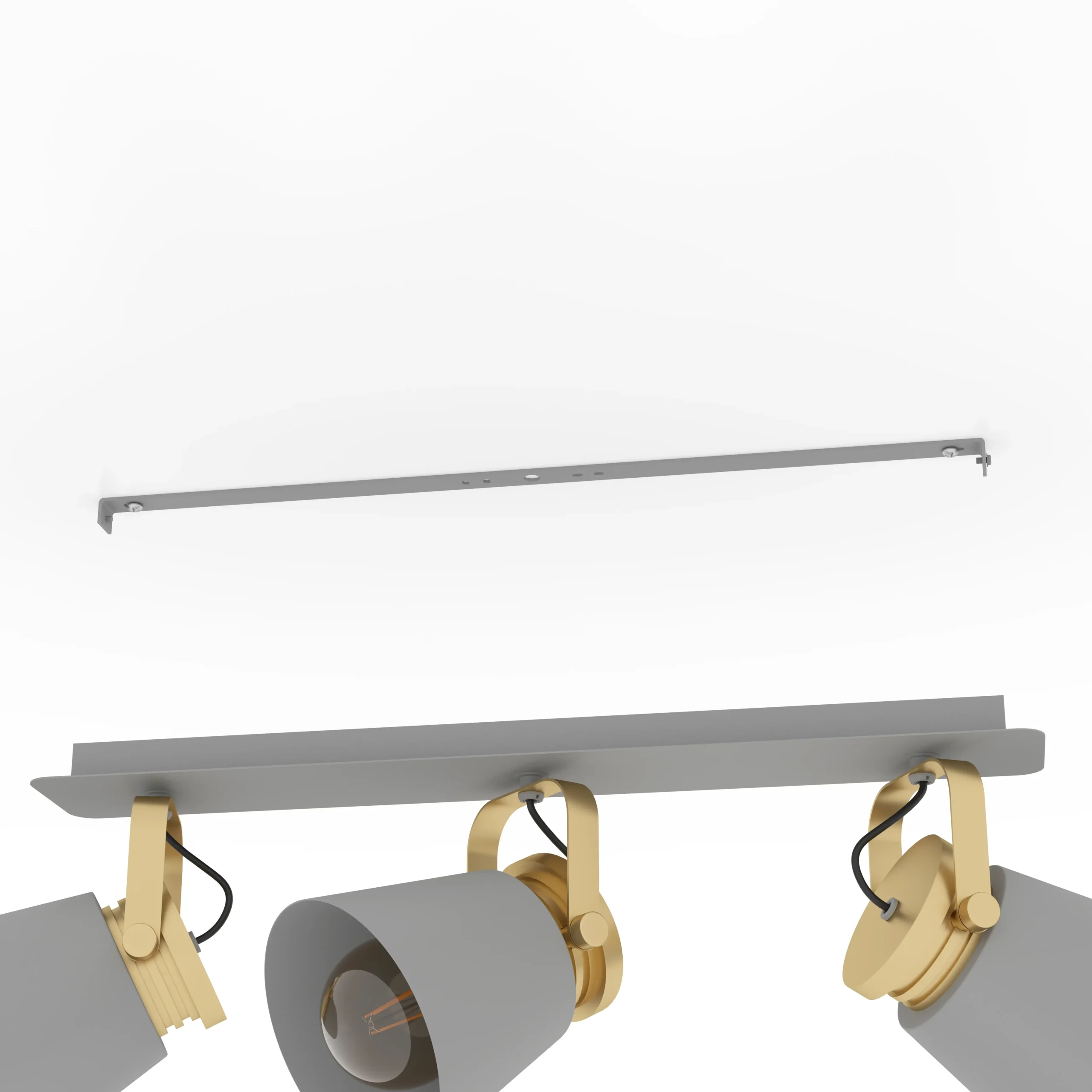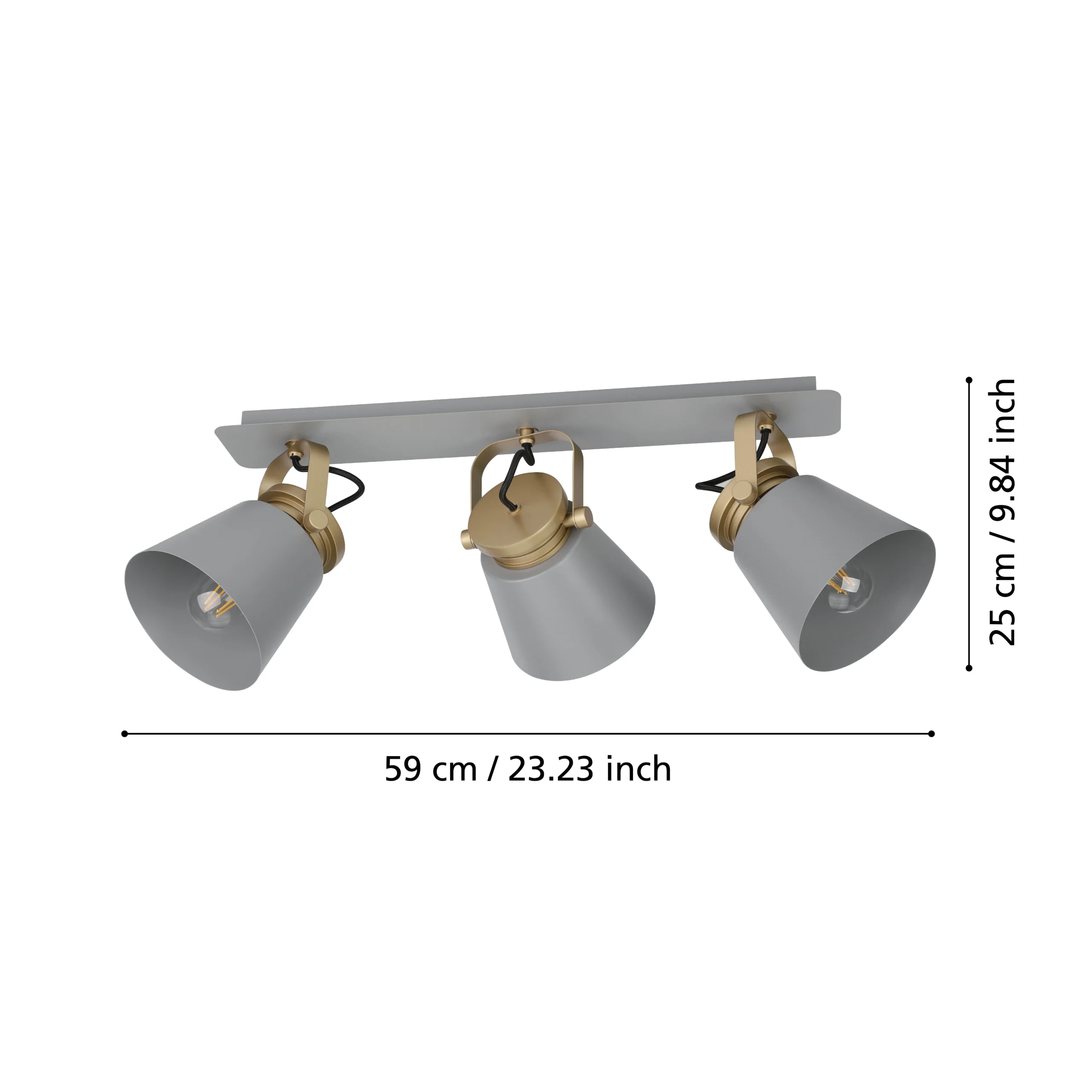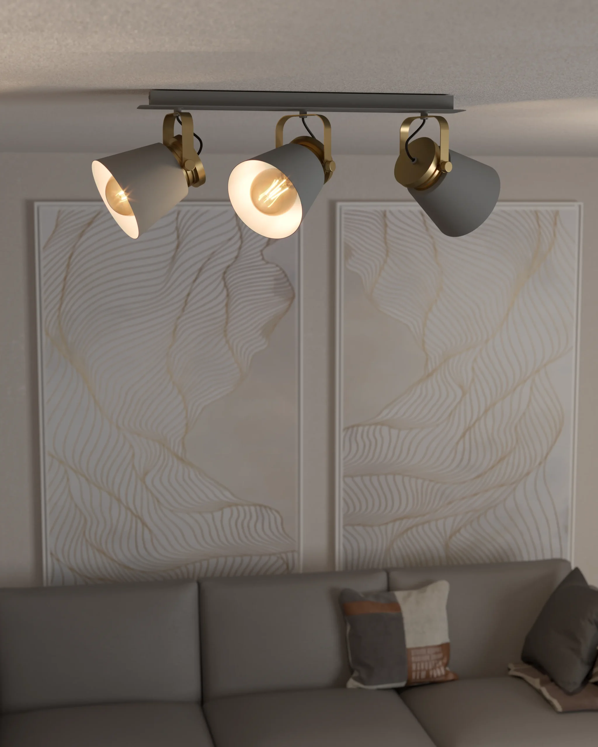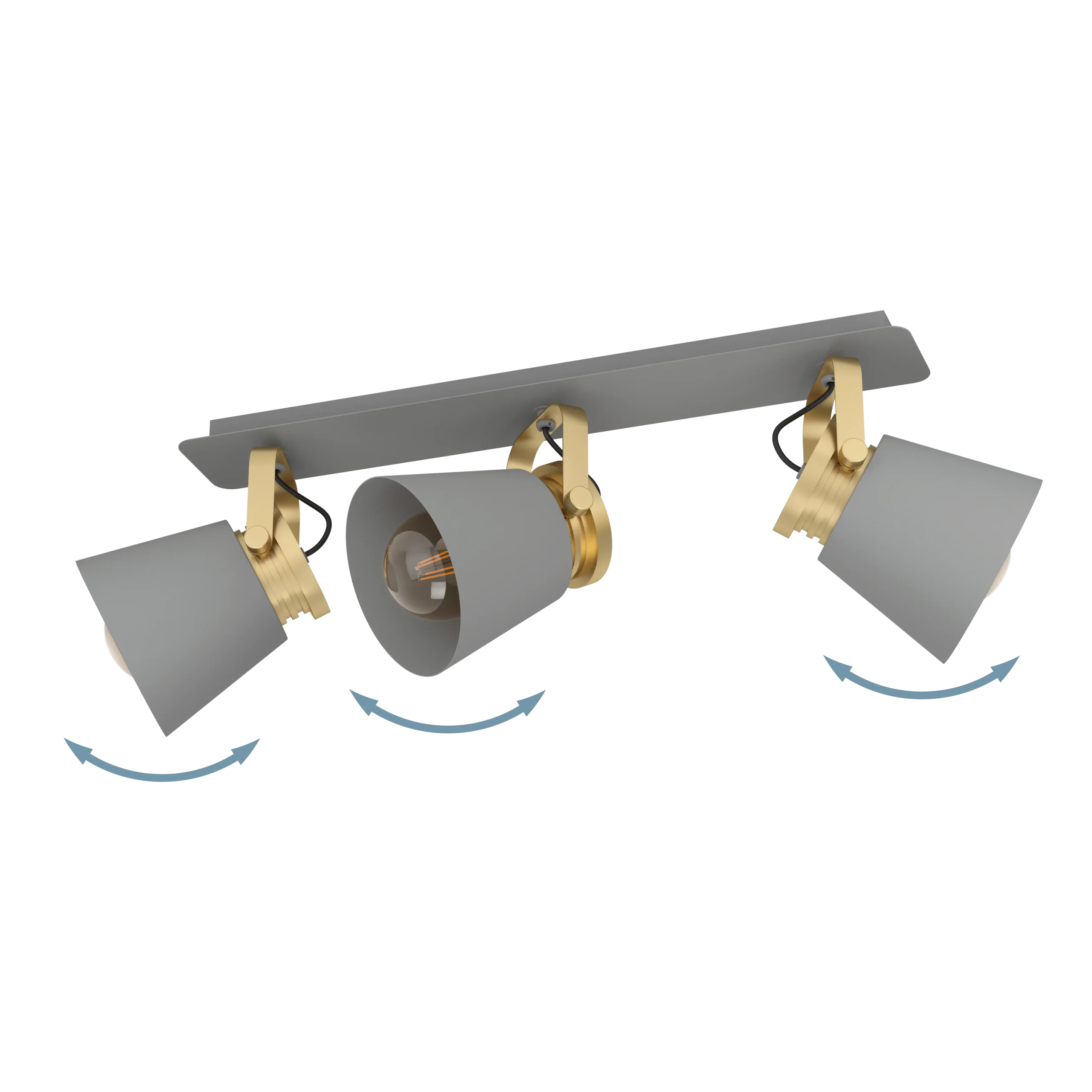 Modern vintage-industrial spot light – Three pivoting metal lampshades in grey with gold detailing for directional accent lighting (model43837).
