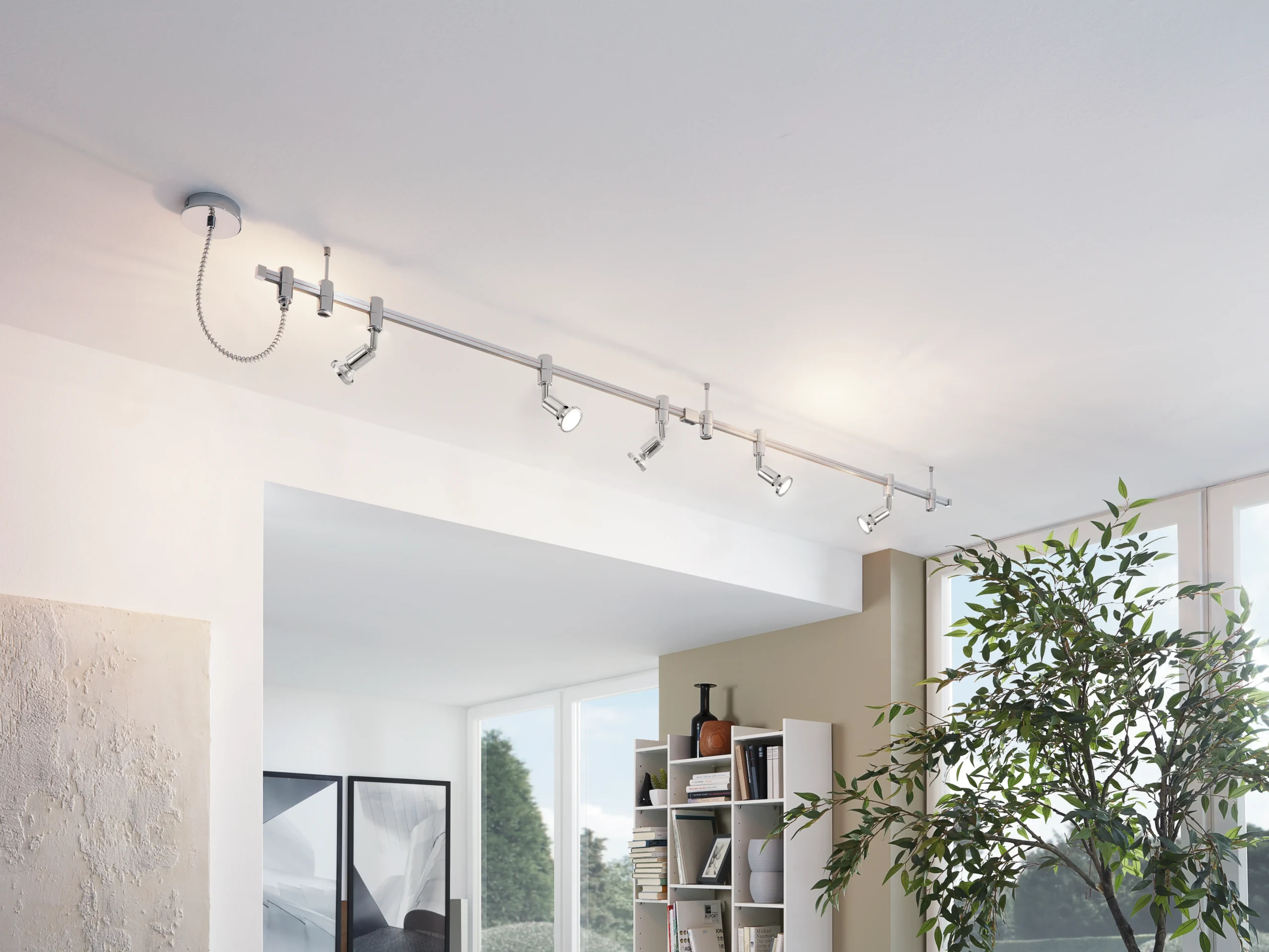 Contemporary 5‑light LED bar system – Sleek aluminium and chrome-finished steel bar measuring 2,000mm (78.7″) long, ideal for modern interiors such as kitchens, hallways, or living areas.