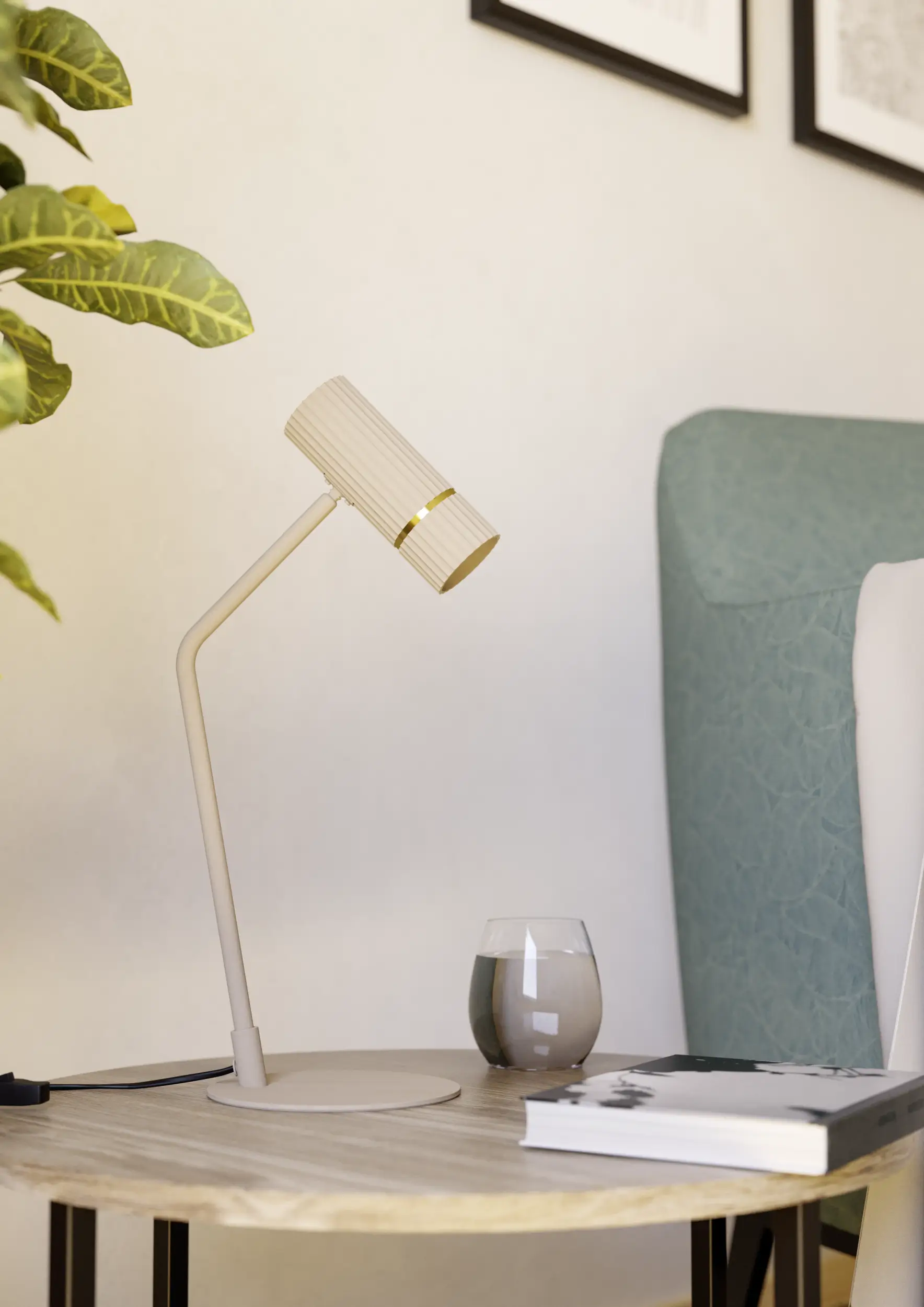 The CAMINIA table lamp features an elegant blend of sandy steel and brushed brass, delivering a warm, modern aesthetic. With integrated warm white LED lighting and a convenient in-line switch, it is ideal for bedside tables, desks, and ambient lighting in contemporary interiors.