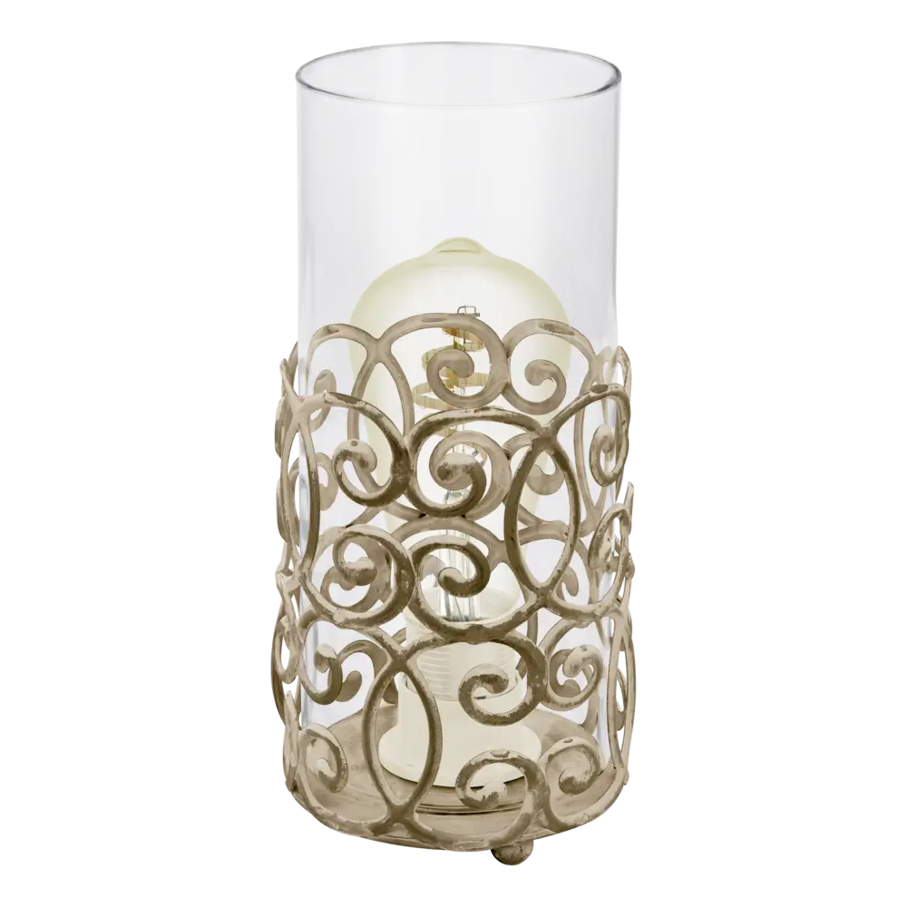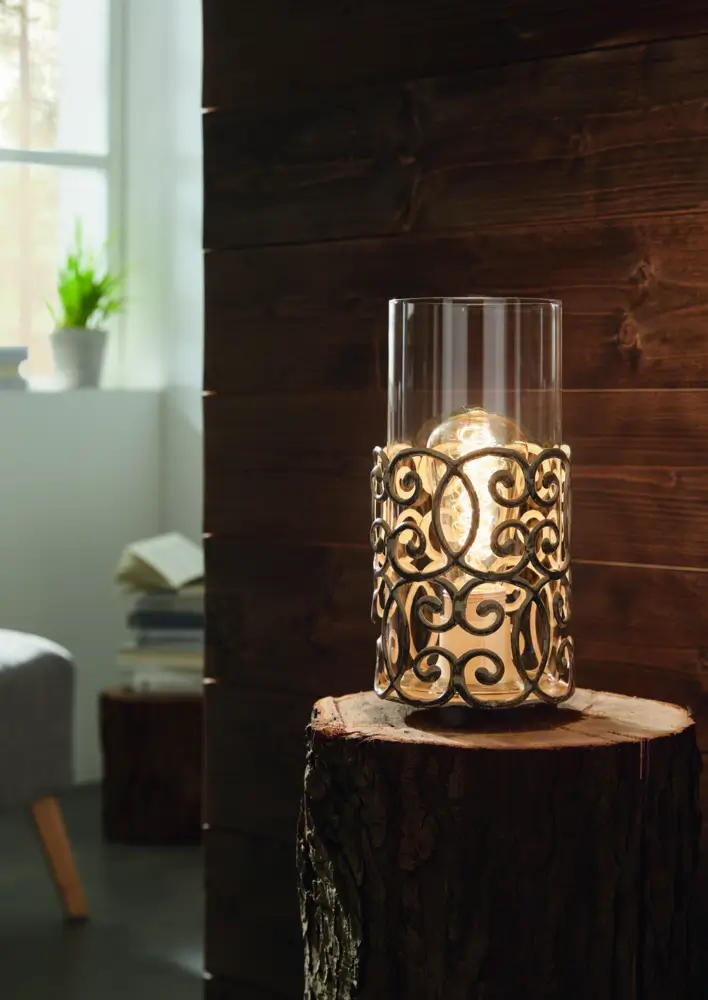 Charming Vintage Design Features a clear glass cylinder nestled in an intricate brown‑patina steel cage—evoking nostalgic, bohemian, or Art Nouveau inspirations. Single E27 Socket Requires one E27 bulb (max. 60W; not included), compatible with decorative filament, LED, or classic incandescent options