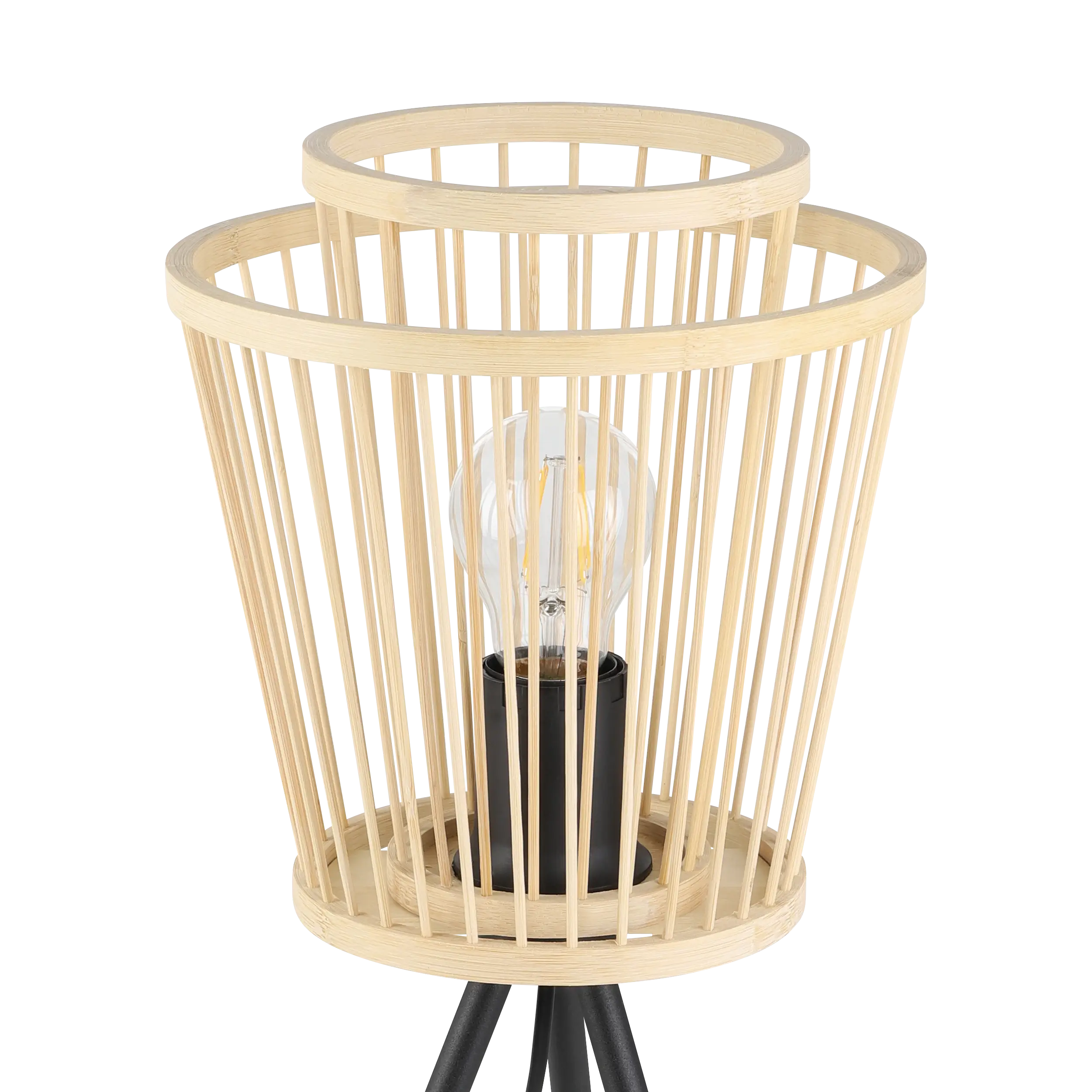 Boho-Natural Look: Features a black steel base supporting two nested bamboo shades, creating warm ambient light and intriguing shadow patterns—ideal for bedside tables, desks, or living spaces.
