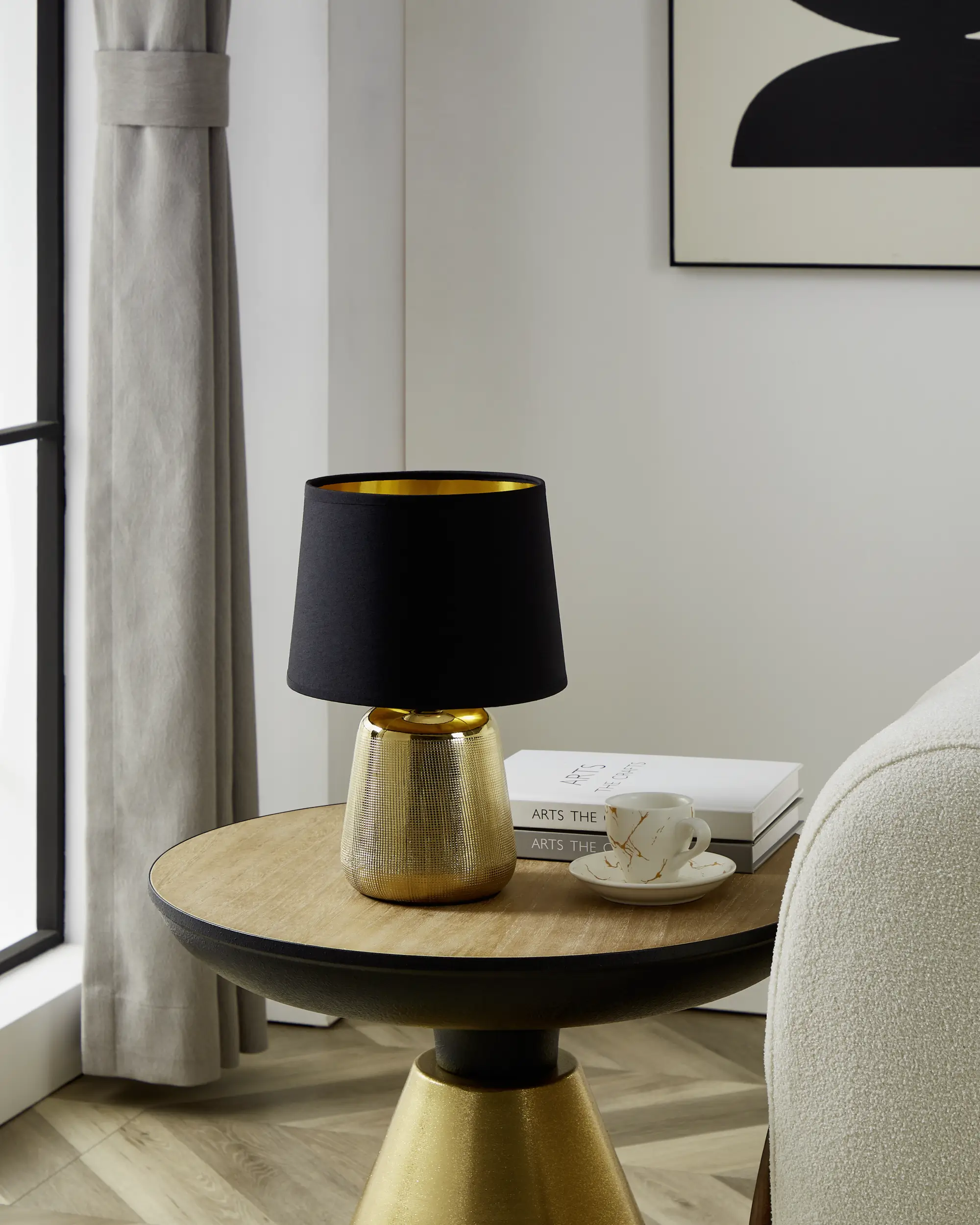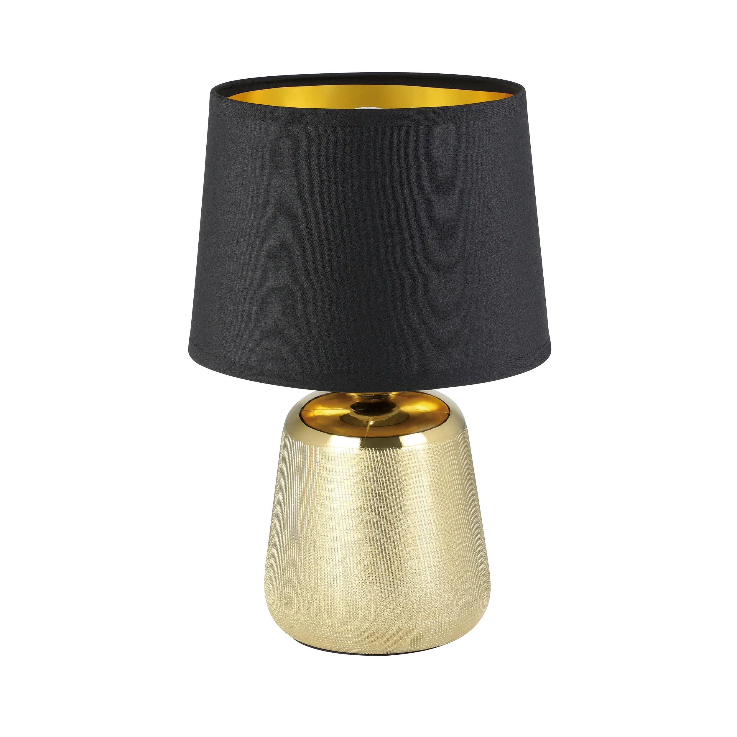 Elegant Contemporary Design: The EGLO MANALBA 1 99331 Table Lamp features a gold-coloured ceramic base paired with a black fabric shade lined in gold, offering a sophisticated aesthetic that complements various interior styles.