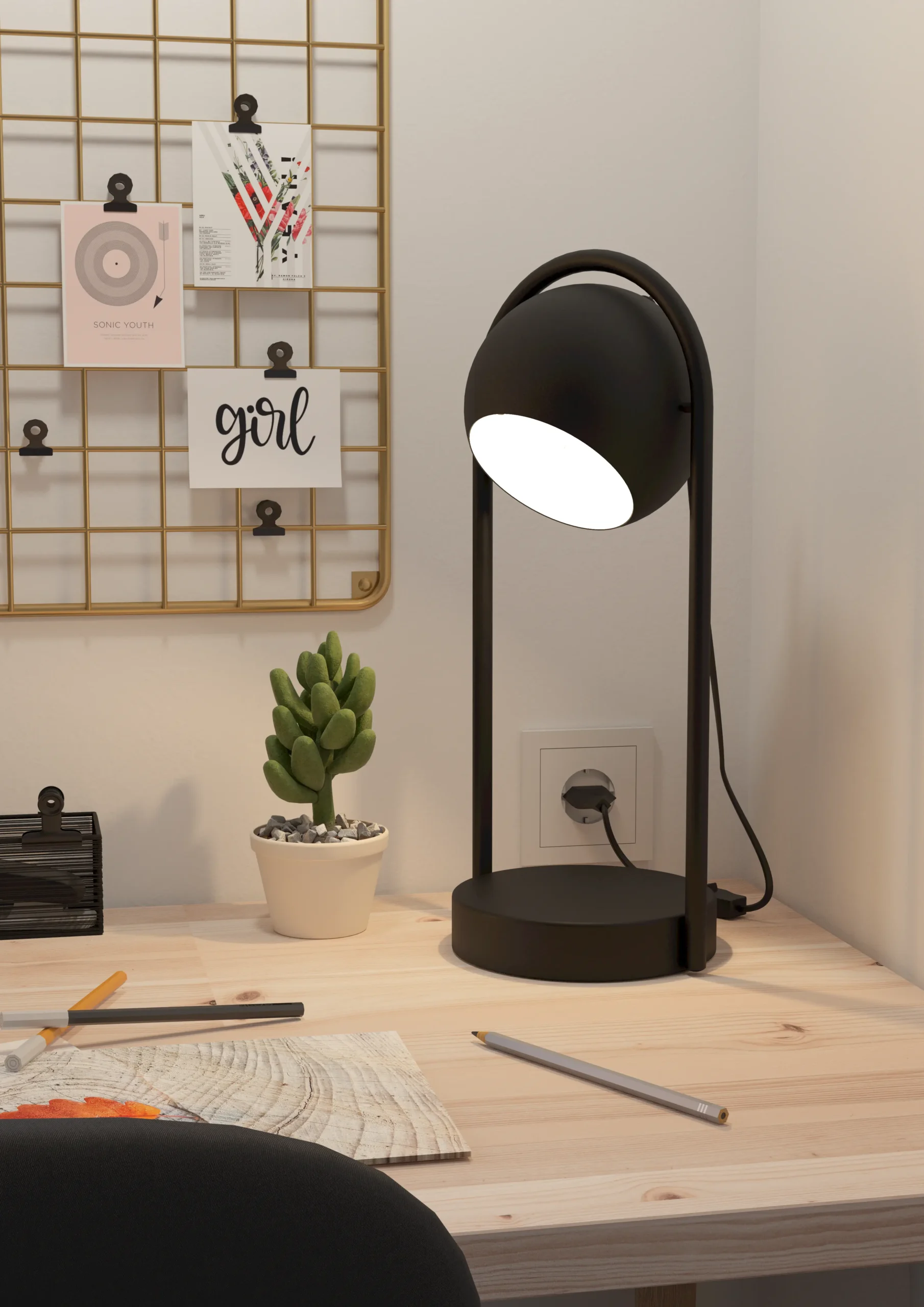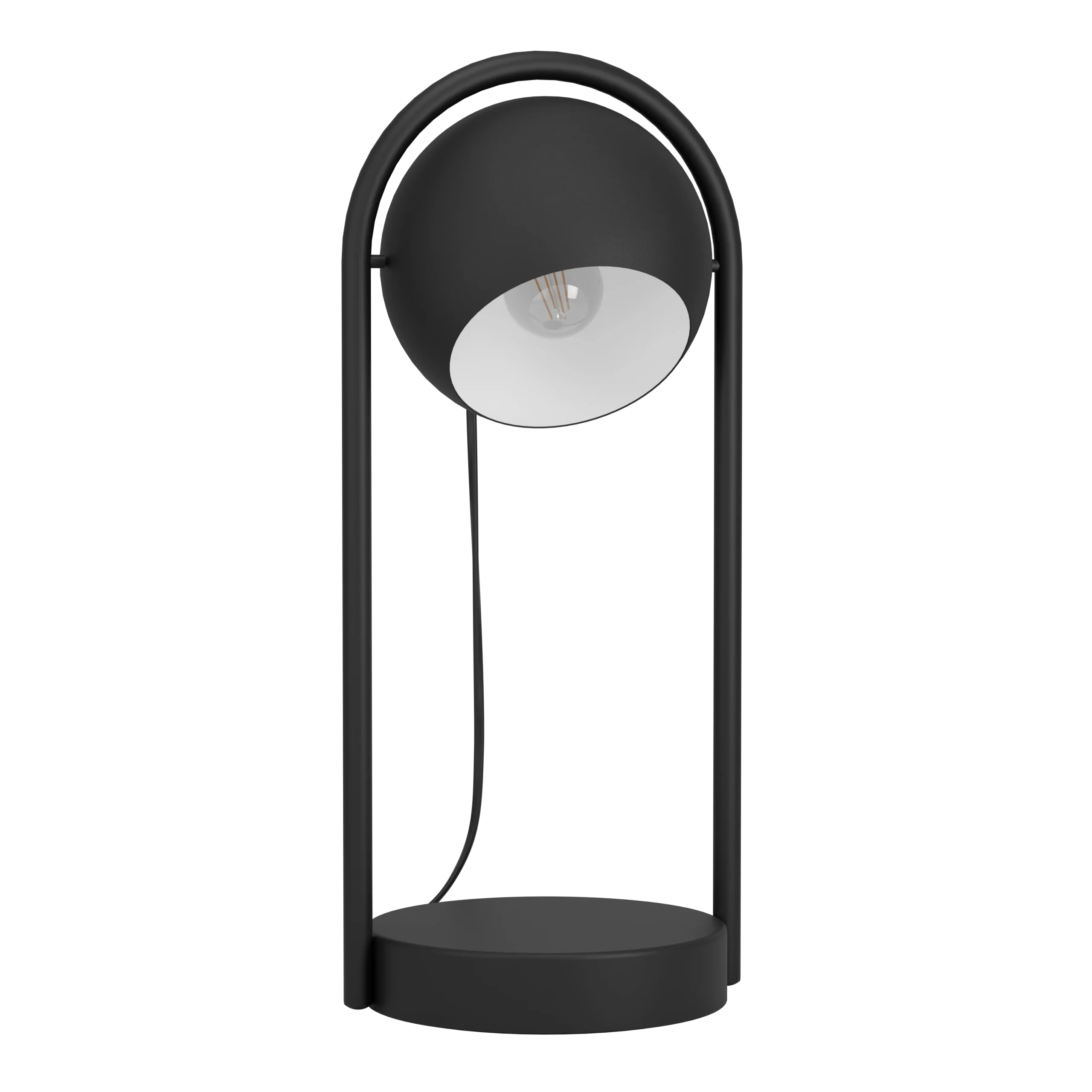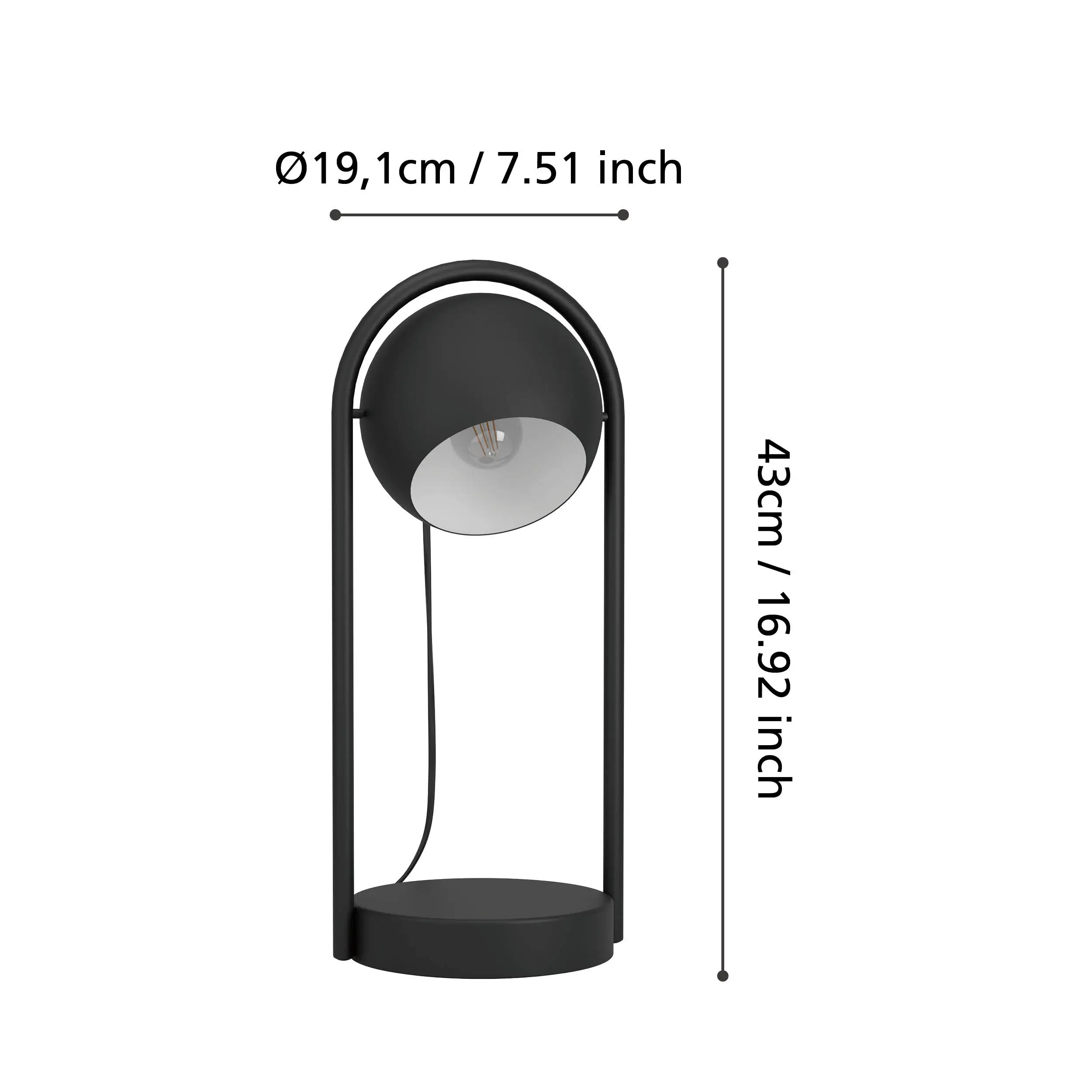 Contemporary Nordic Design: Sleek steel body in matte black with an adjustable spherical shade featuring a white interior for focused task lighting