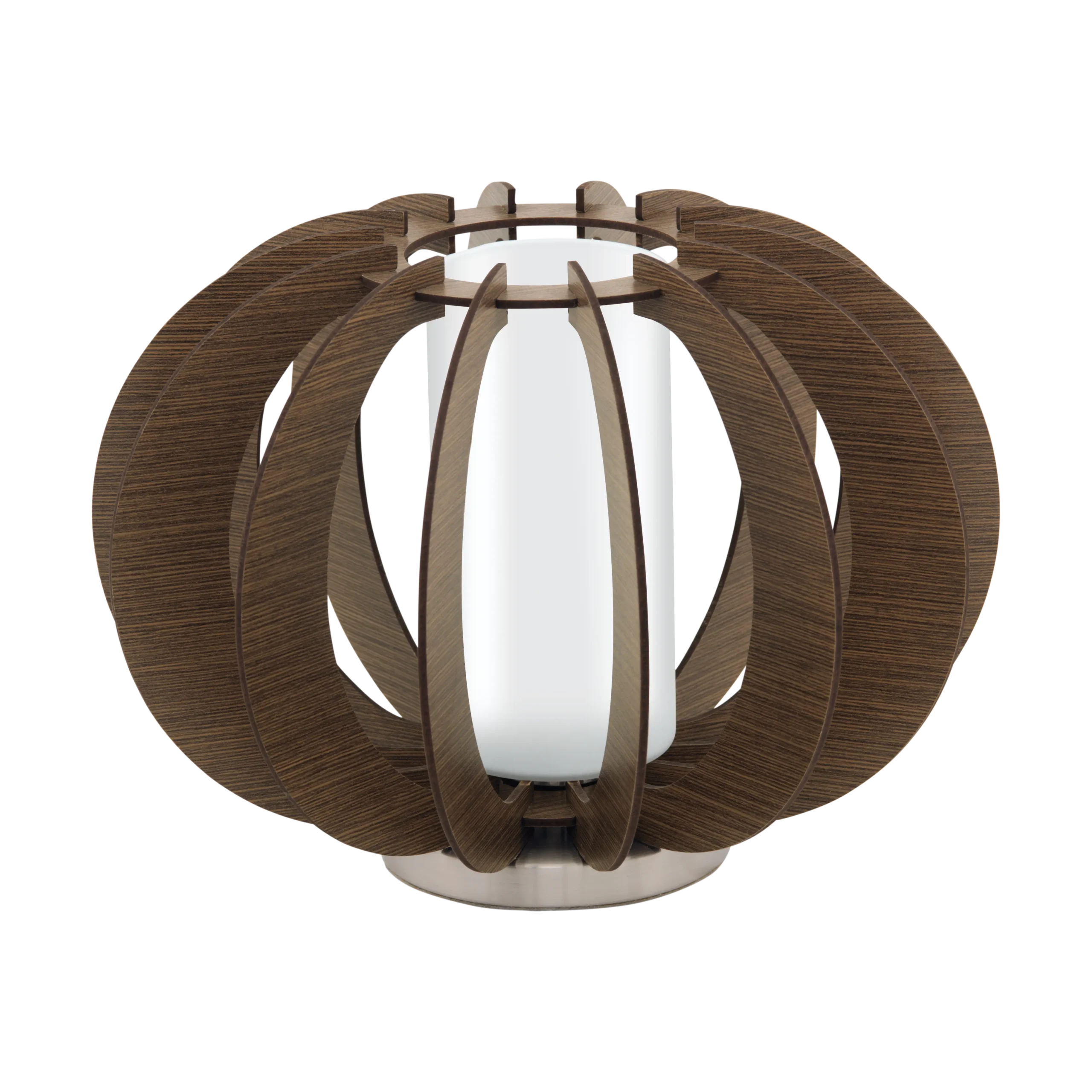 Warm Natural Design: Combination of satin nickel steel body with brown maple‑wood slats and white glass shade creates a cozy yet contemporary bedside or desk lighting solution.