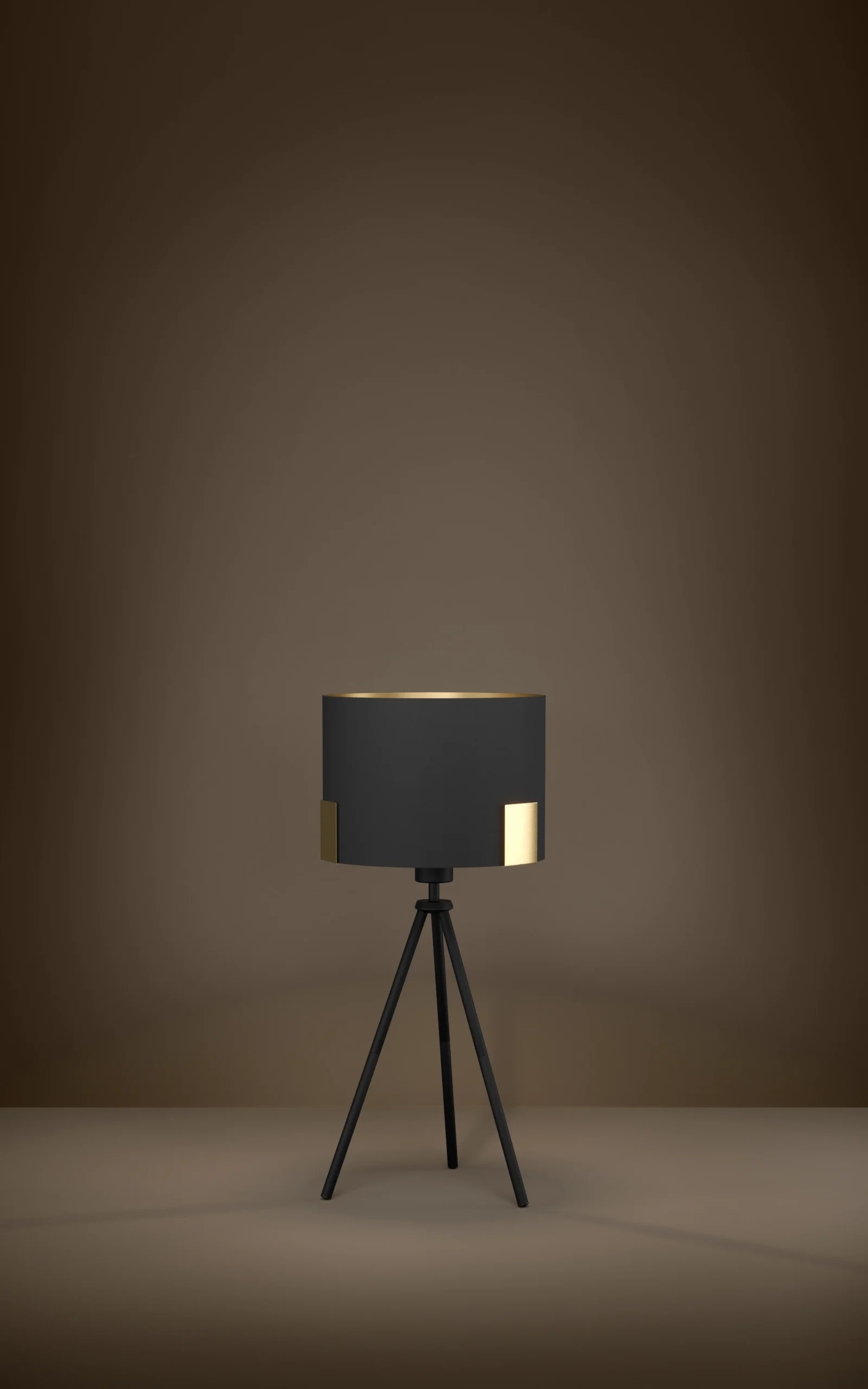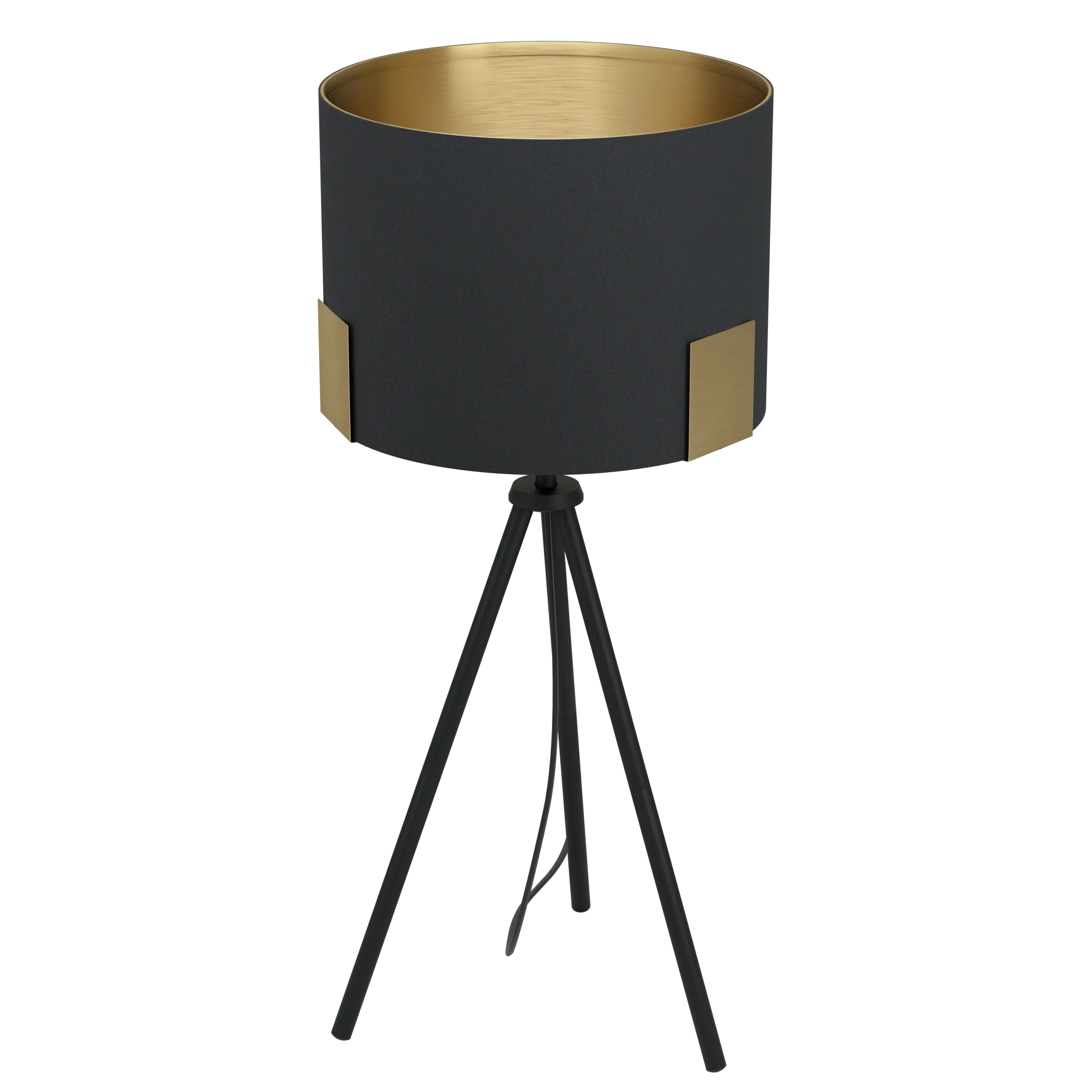 Contemporary Tripod Style: Boasts a sleek black steel tripod base with a round black fabric shade and brass‑effect inner finish—adds warmth and sophistication to bedside tables or living spaces.