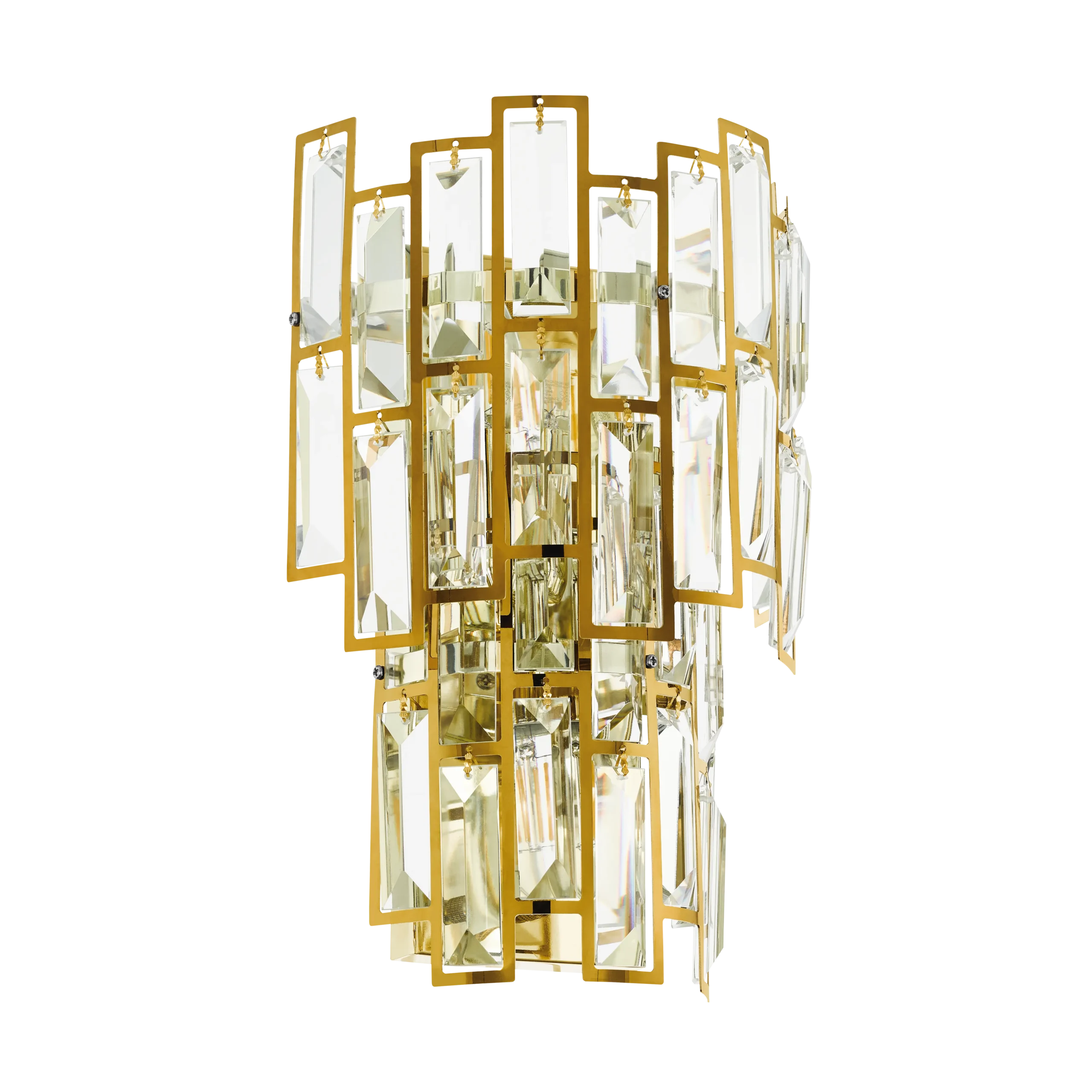 Luxurious crystal wall sconce – Brass-colored steel frame adorned with multiple rows of clear brilliant glass crystals for a sparkling, high-end effect.