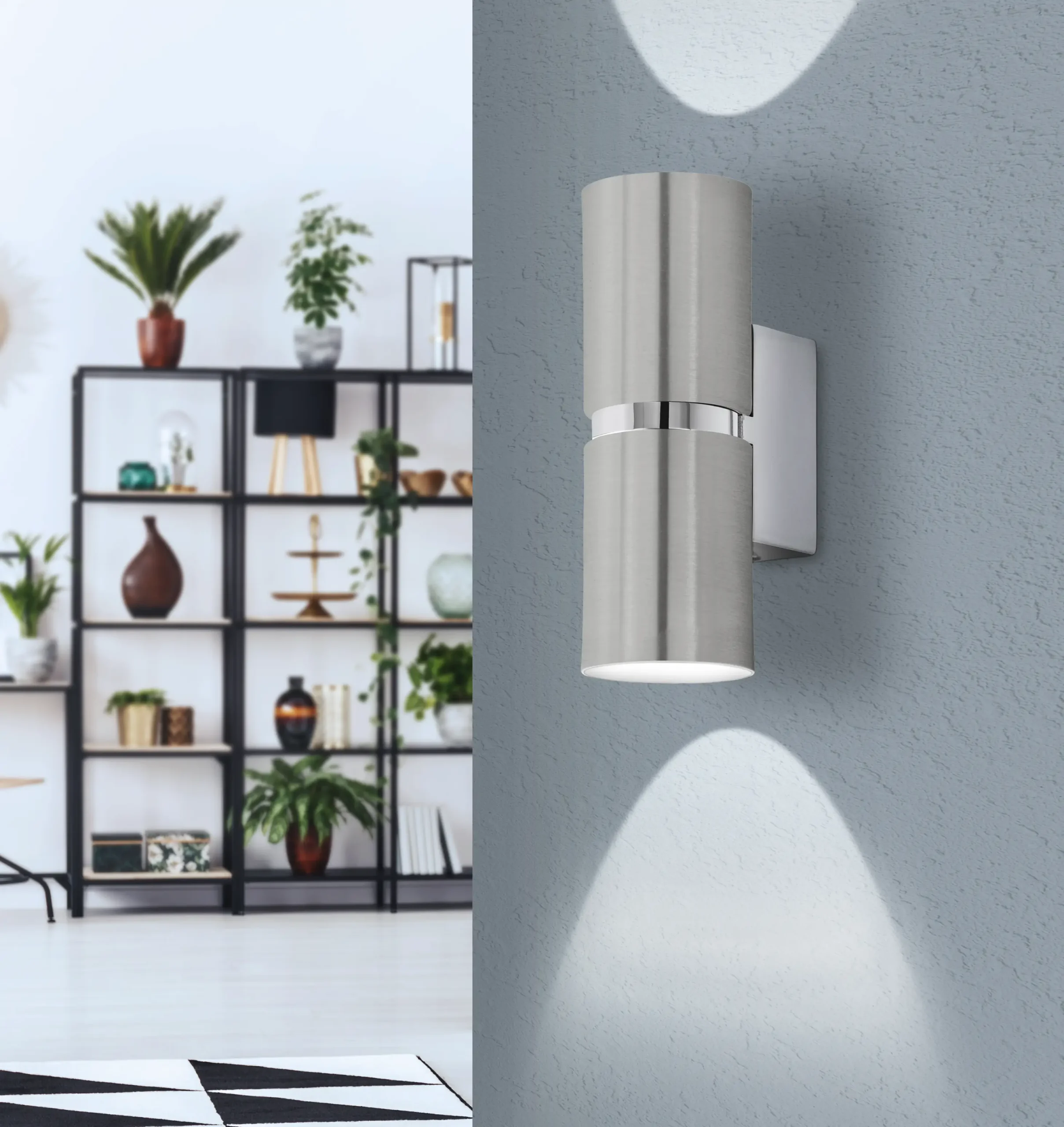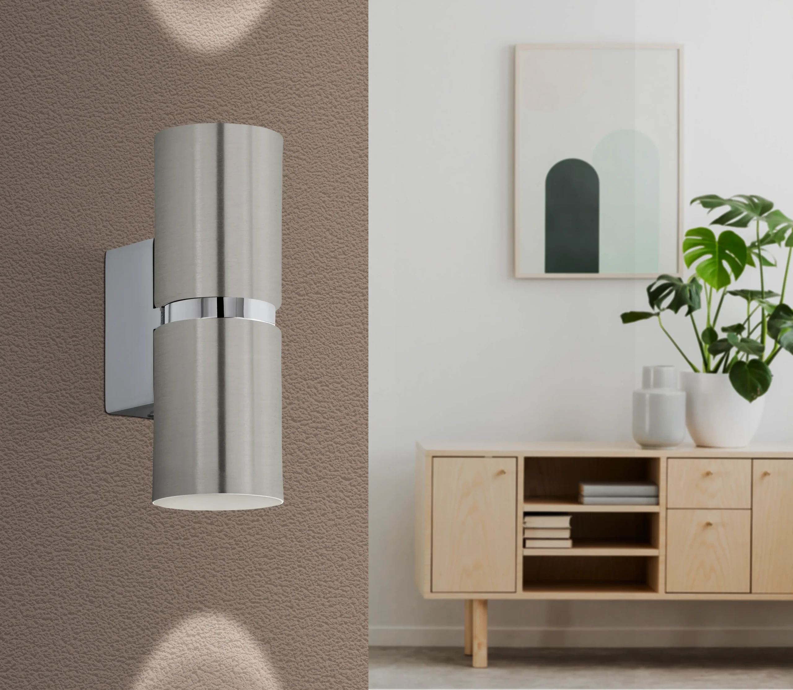 Minimalist Two‑Light Design: Cylindrical satin-nickel and chrome-steel housings provide up/down illumination—perfect for modern interiors.