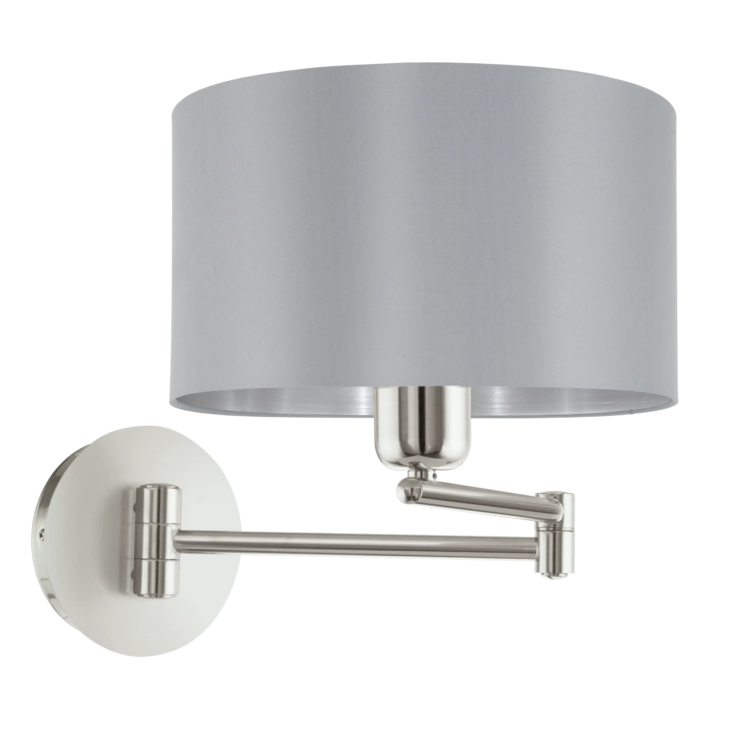 The EGLO MASERLO indoor wall light features a satin nickel steel enclosure paired with a stylish fabric shade in grey and silver tones. It has an IP20 protection rating for indoor use and includes a convenient rocker switch. The light supports an E27 lamp socket with a maximum wattage of 60W. With dimensions of 260 mm height and 230 mm diameter and an overhang of 595 mm, MASERLO offers a modern fabric-concept design ideal for sophisticated interiors.