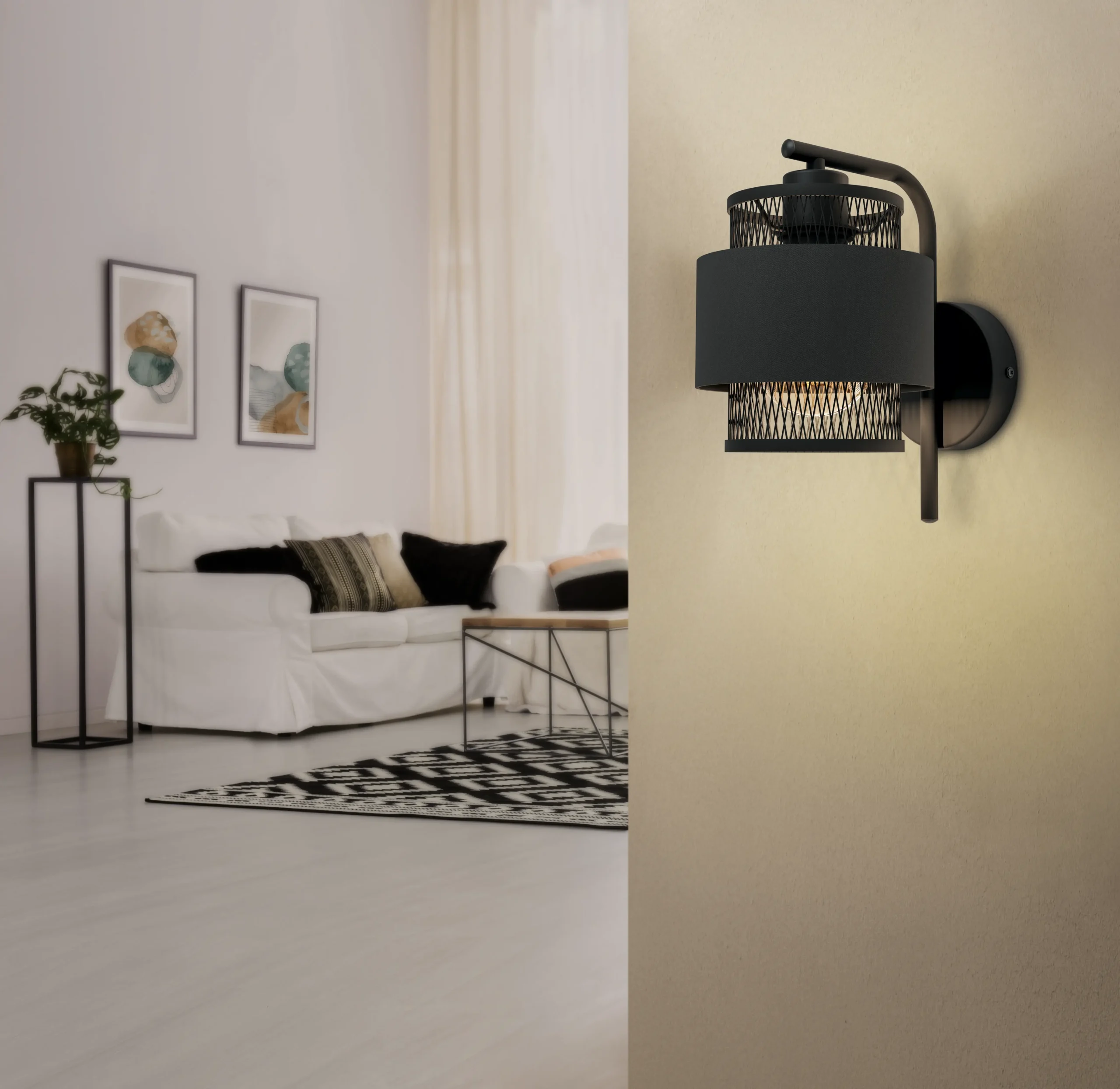 Modern MONOchrome Design: Black steel backplate and arm paired with a black fabric shade—ideal for contemporary interiors.