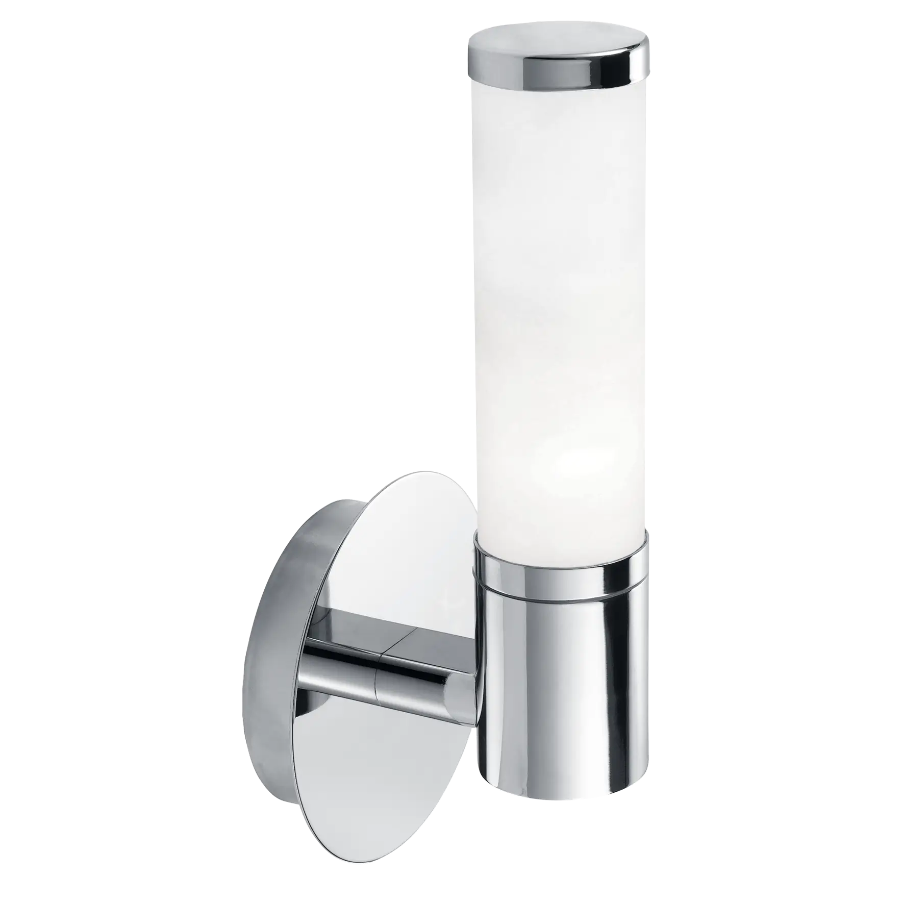 Modern Bathroom Design: Styled with a polished chrome steel frame and a white matte-opal glass shade, offering a clean and contemporary look suitable for bathroom interiors.