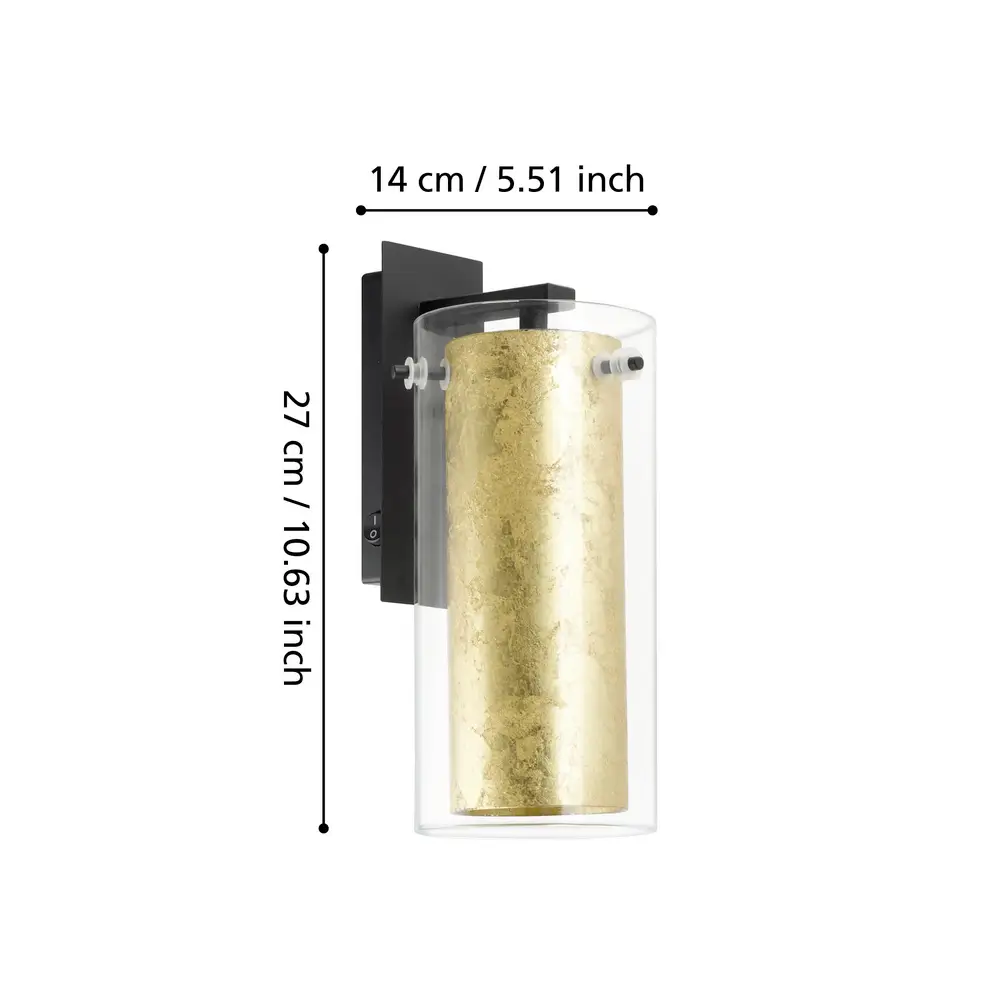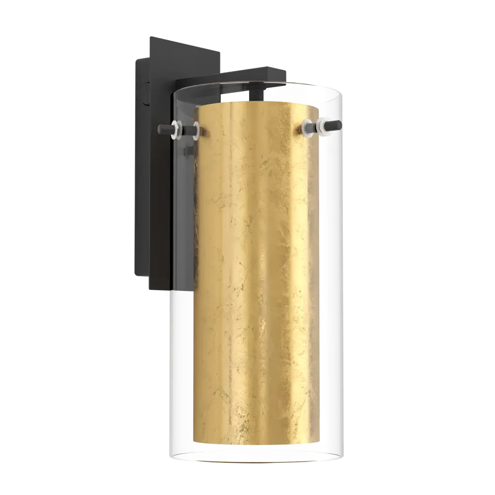 Luxurious Black & Gold-Leaf Glass – Features a matte black steel wall mount paired with a double-layer cylindrical glass shade: an outer clear glass and inner gold-leaf finish that emits a rich, warm glow when illuminated.