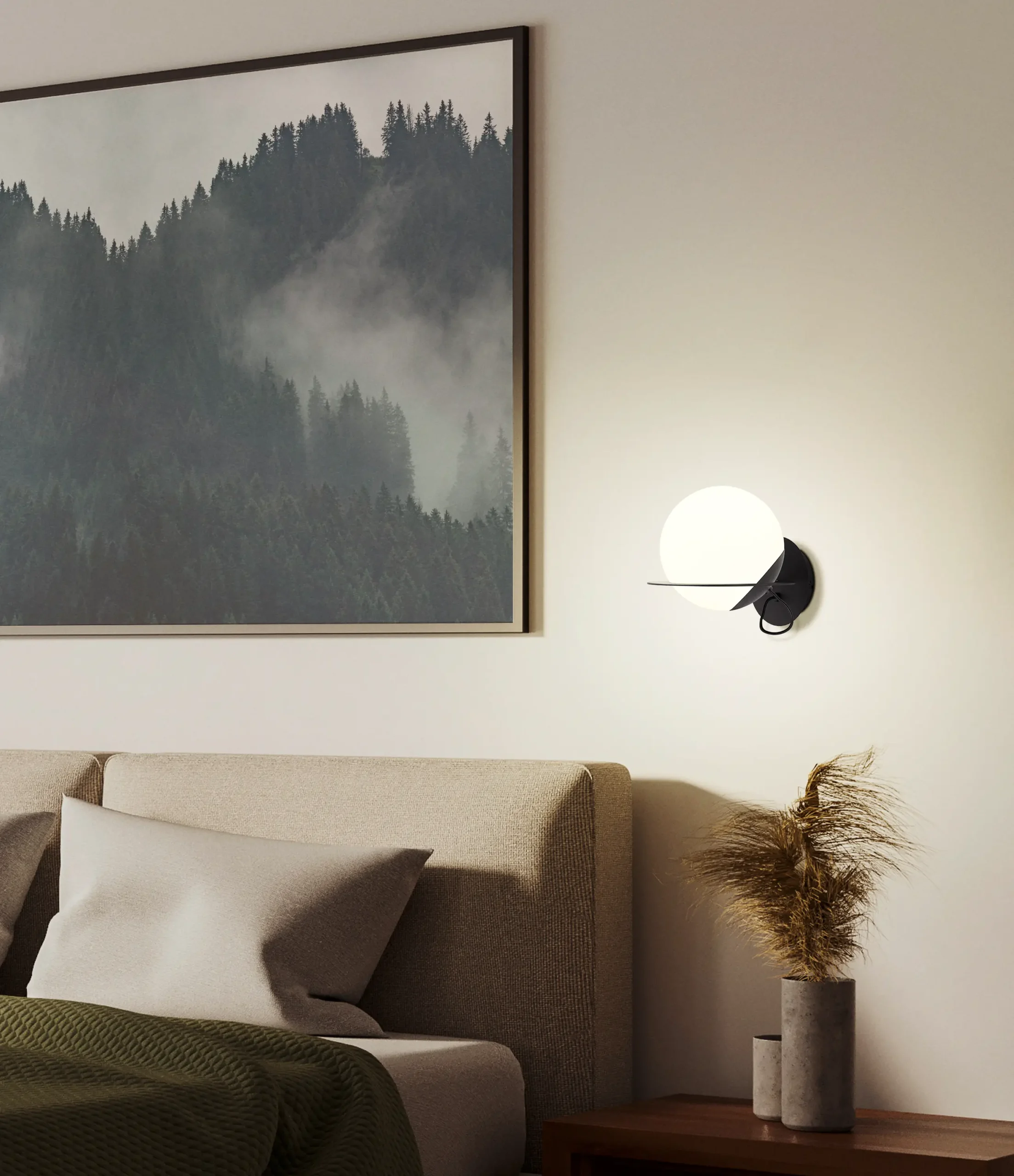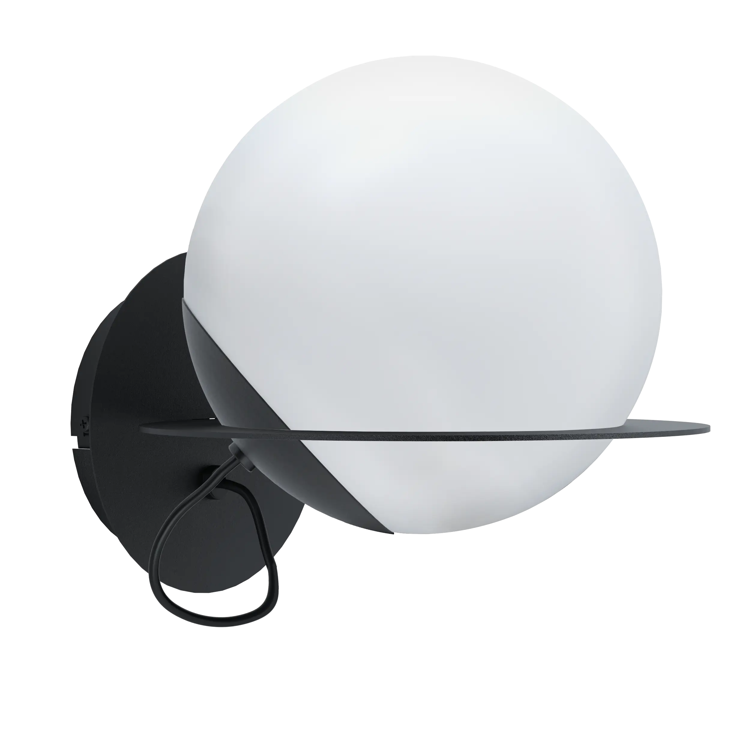 Contemporary Black & Opal Globe Design – Features a sleek black powder-coated steel bracket supporting a matte opal glass globe for a soft, ambient glow—perfect for modern bedrooms, hallways, and staircases.