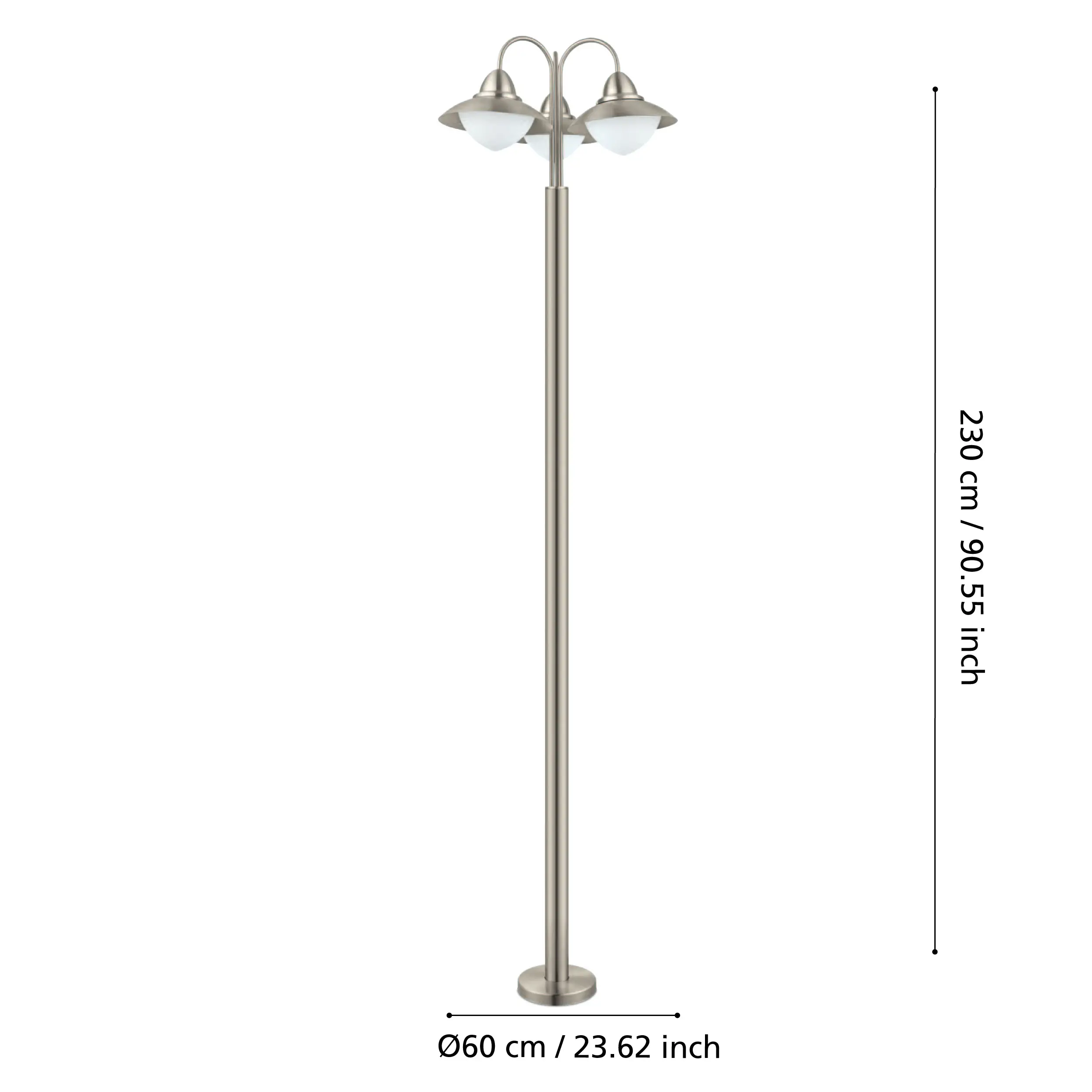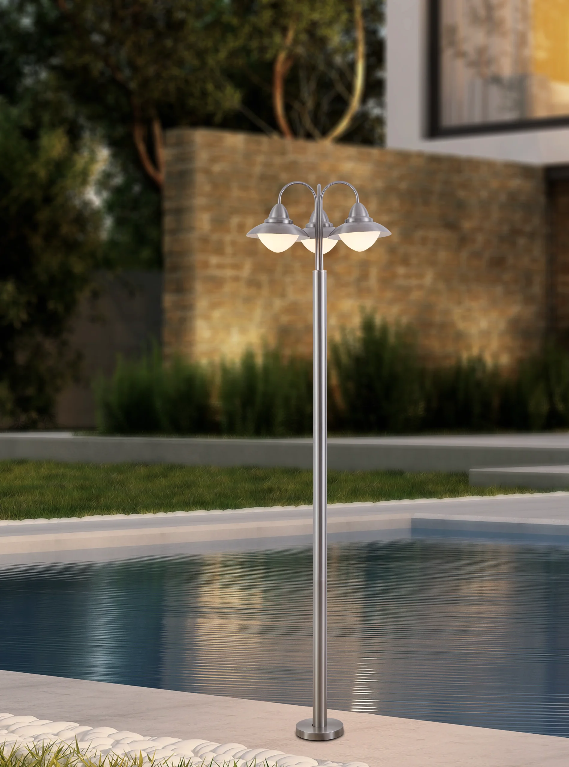 Elegant Three-Lamp Bollard Design – Features a tall (220cm / 86.6″) stainless-steel post crowned with three matte-opal glass heads for soft, ambient pathway or garden Lamping.