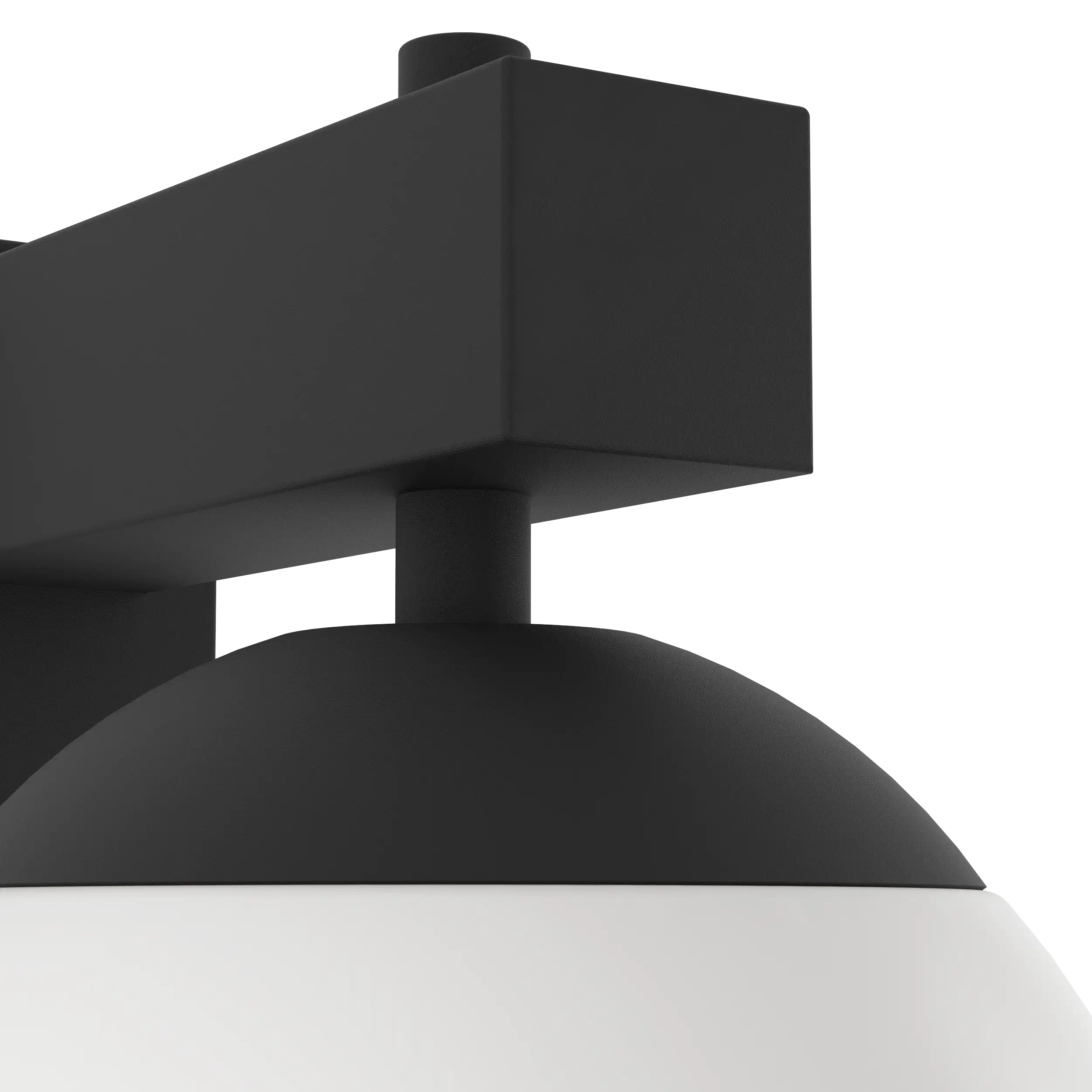 Sleek, Modern Exterior Design: Features a durable black powder‑coated steel arm with clean angles supporting a smooth white plastic globe diffuser, blending seamlessly into contemporary outdoor façades.
