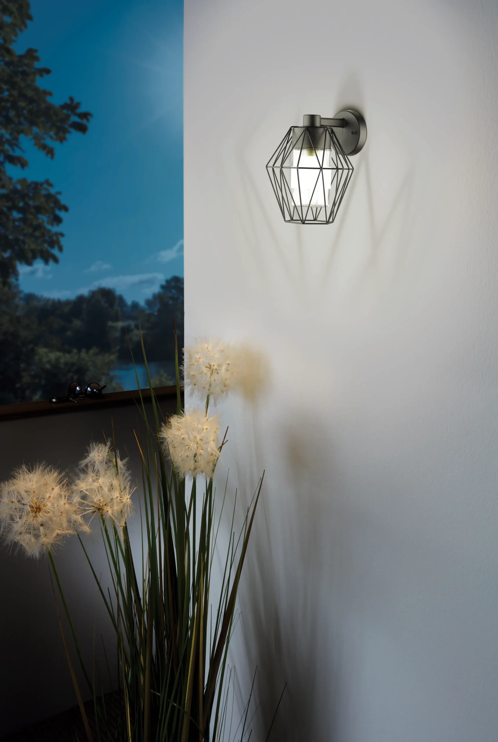 Stylish Outdoor Lantern Design – Features a sleek wire-cage over satin-finished clear glass, combining vintage charm with modern.