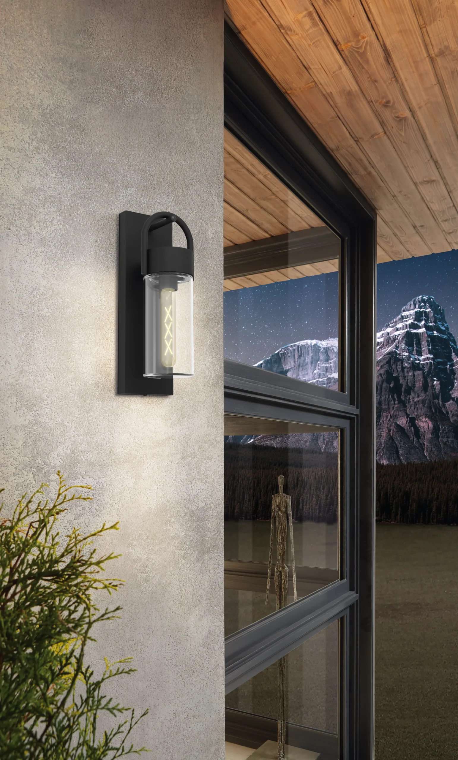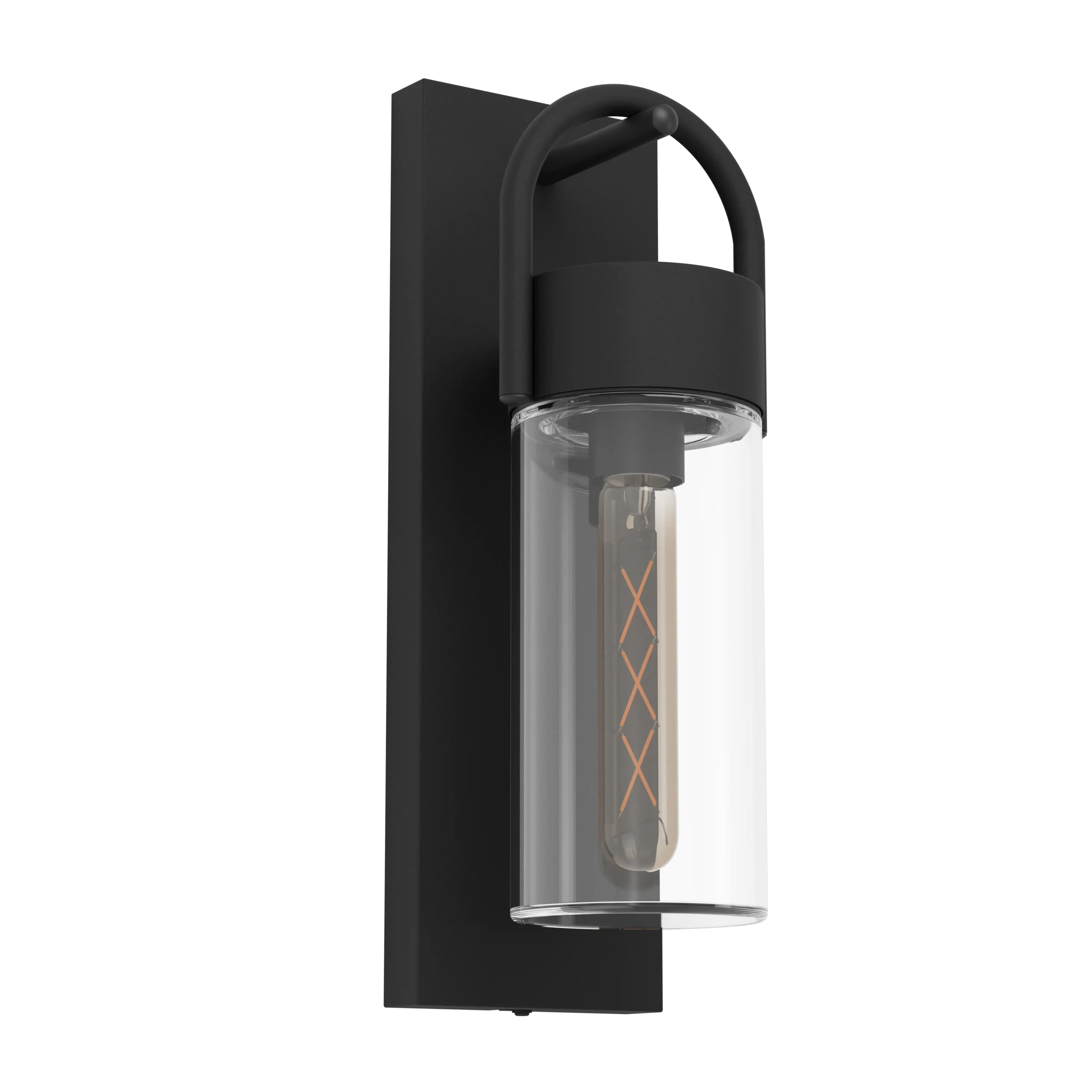 Exposed Lantern Styling: Black steel bracket supporting a clear glass cylinder—showcases the bulb for crisp, modern outdoor Lamping.