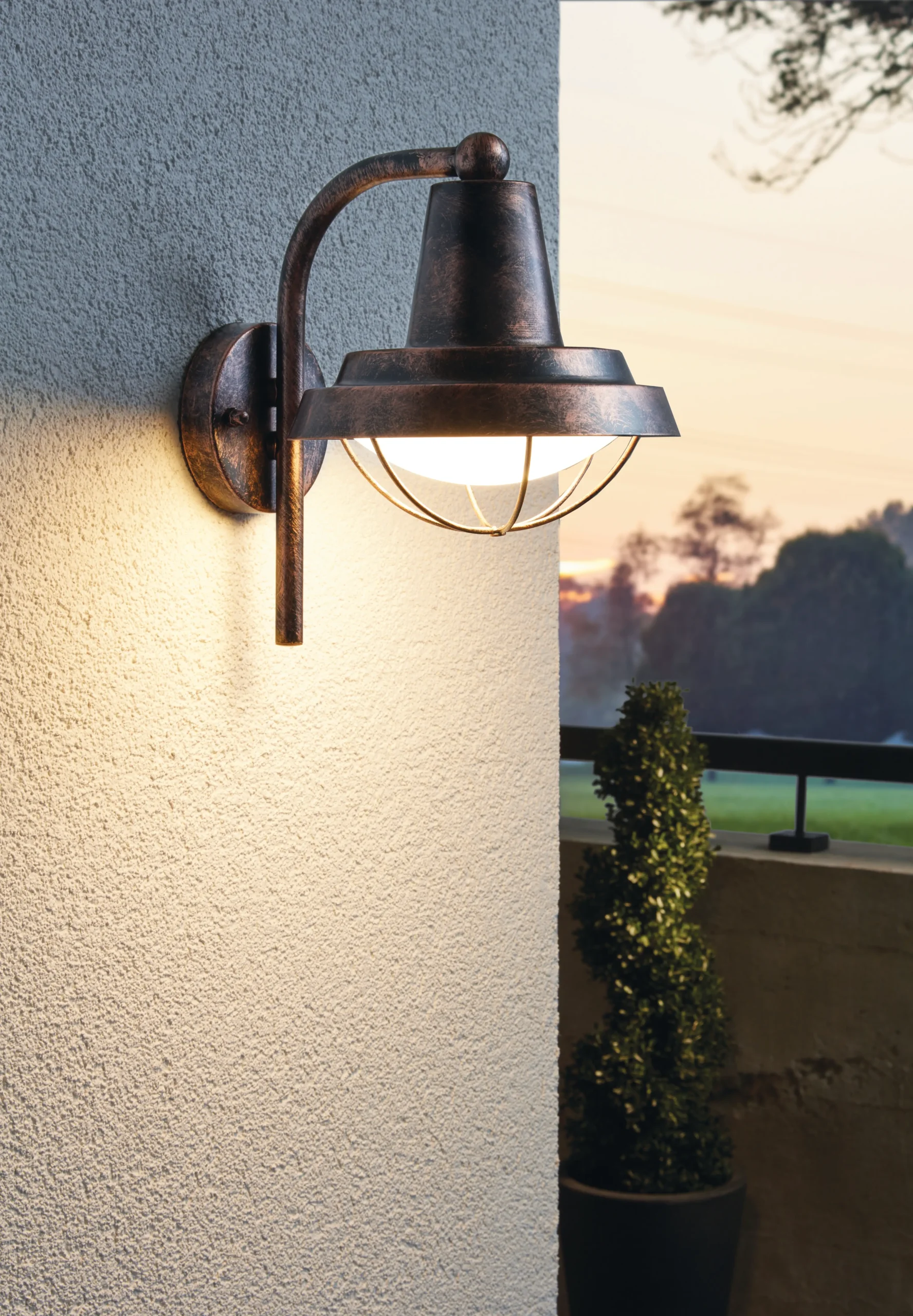Rustic copper-tone lantern design – Antique copper-colored, zinc-plated steel housing with a white plastic diffuser and decorative guard evokes classic industrial charm while adding character to patios, porches, and garden walls.