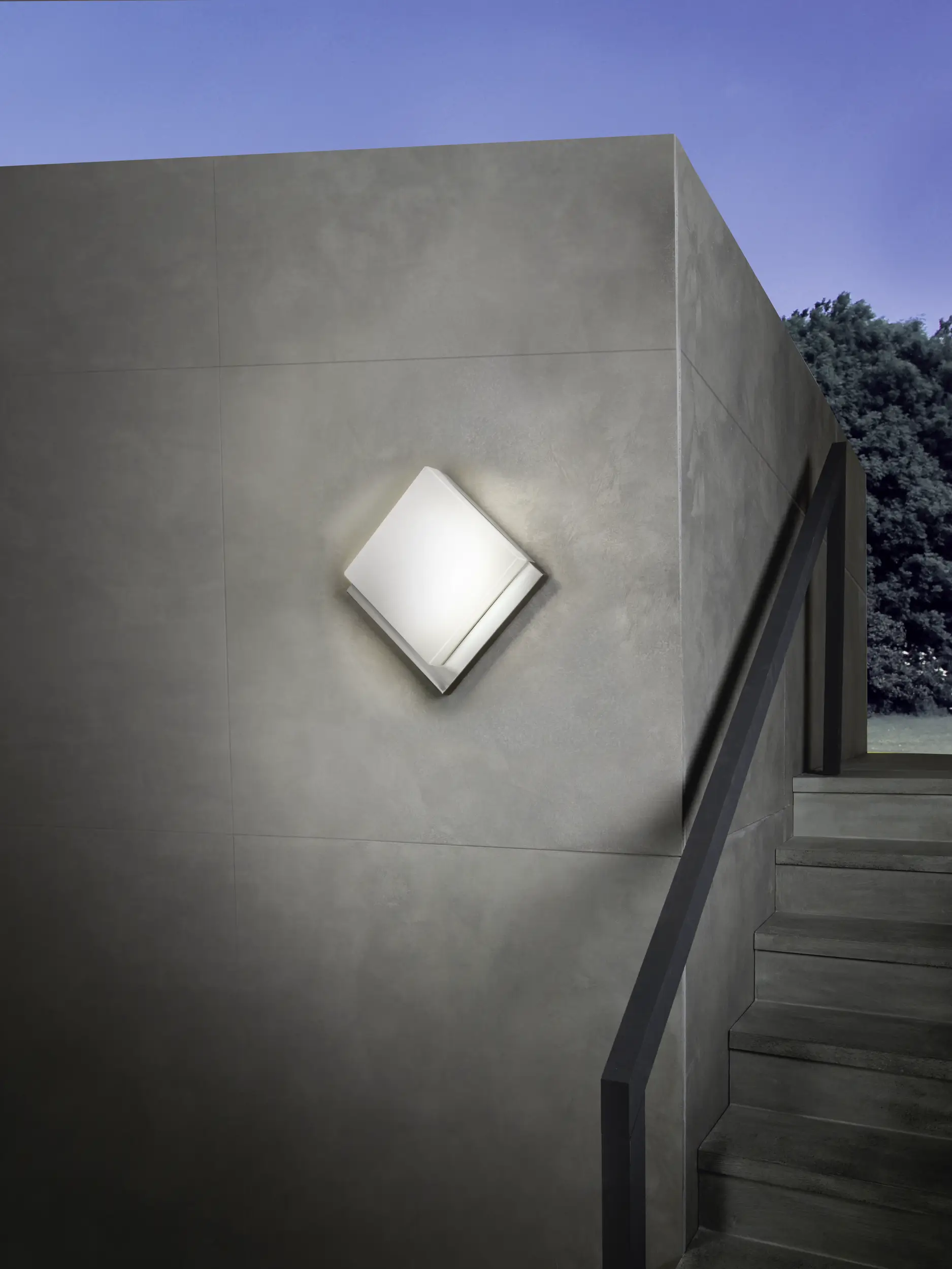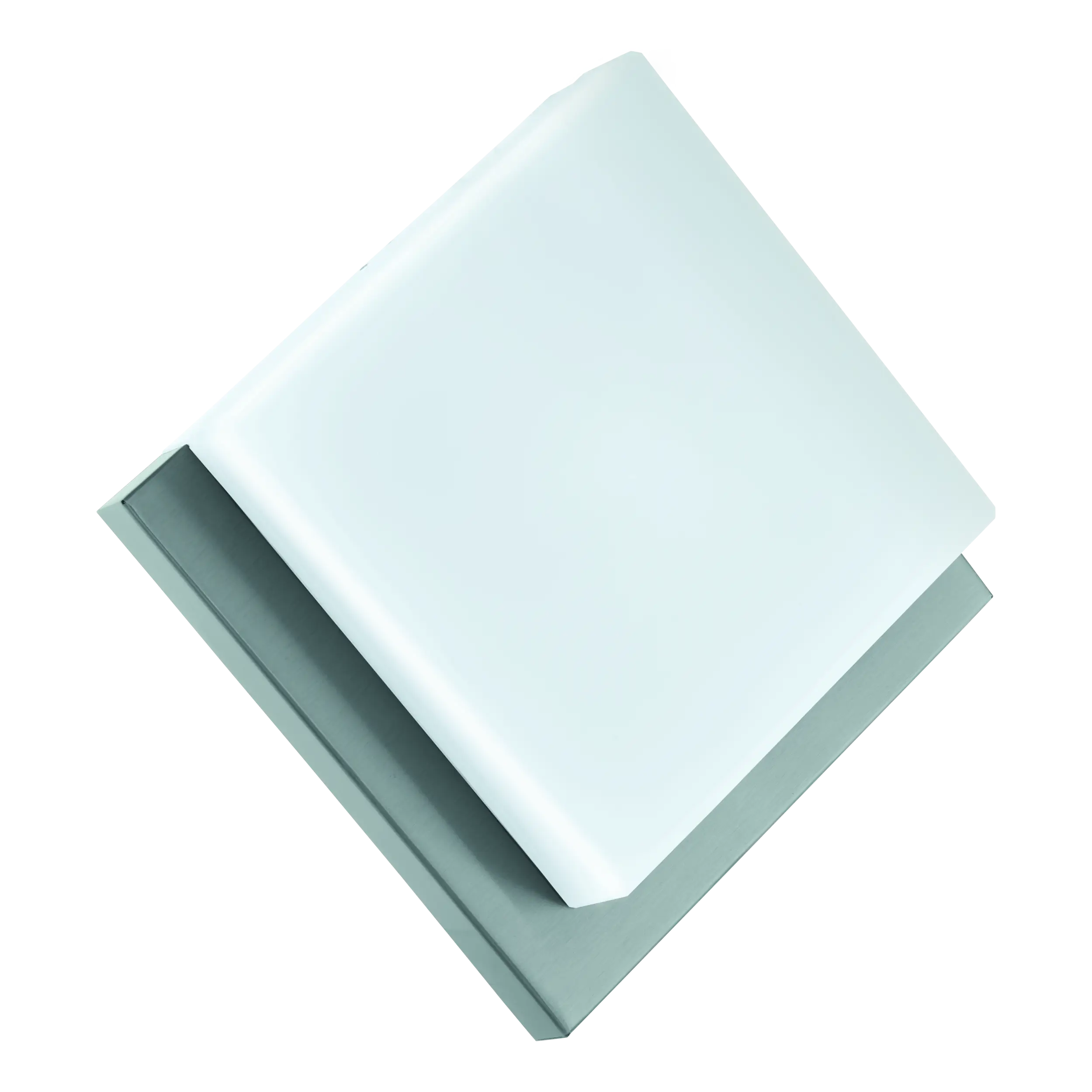 Square wall and ceiling light made from stainless steel and durable plastic with a refined silver finish, suitable for contemporary interiors and exteriors.