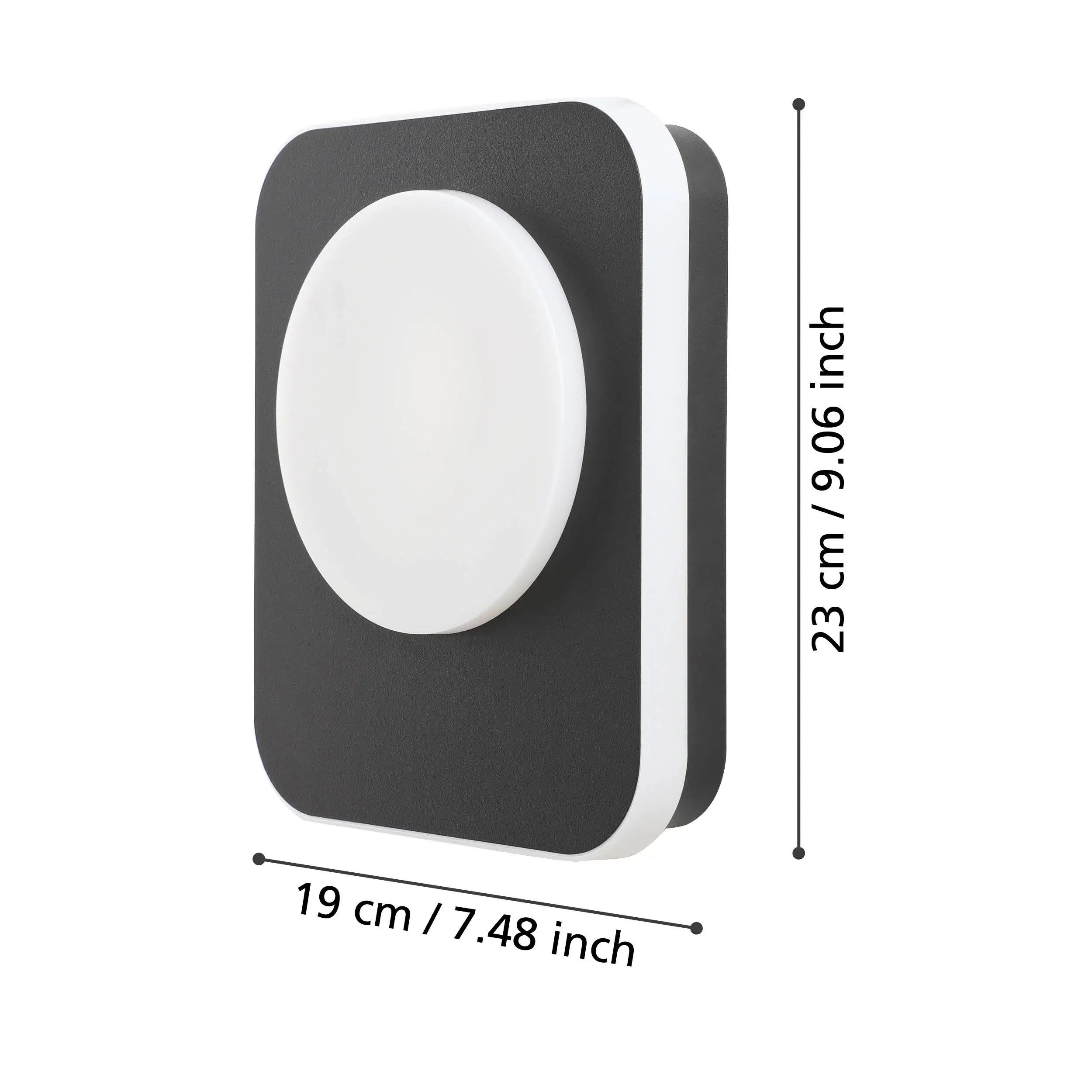 Contemporary outdoor design – Black rectangular cast-aluminium housing with rounded edges features a frosted white plastic band and circular front panel for soft, warming illumination.