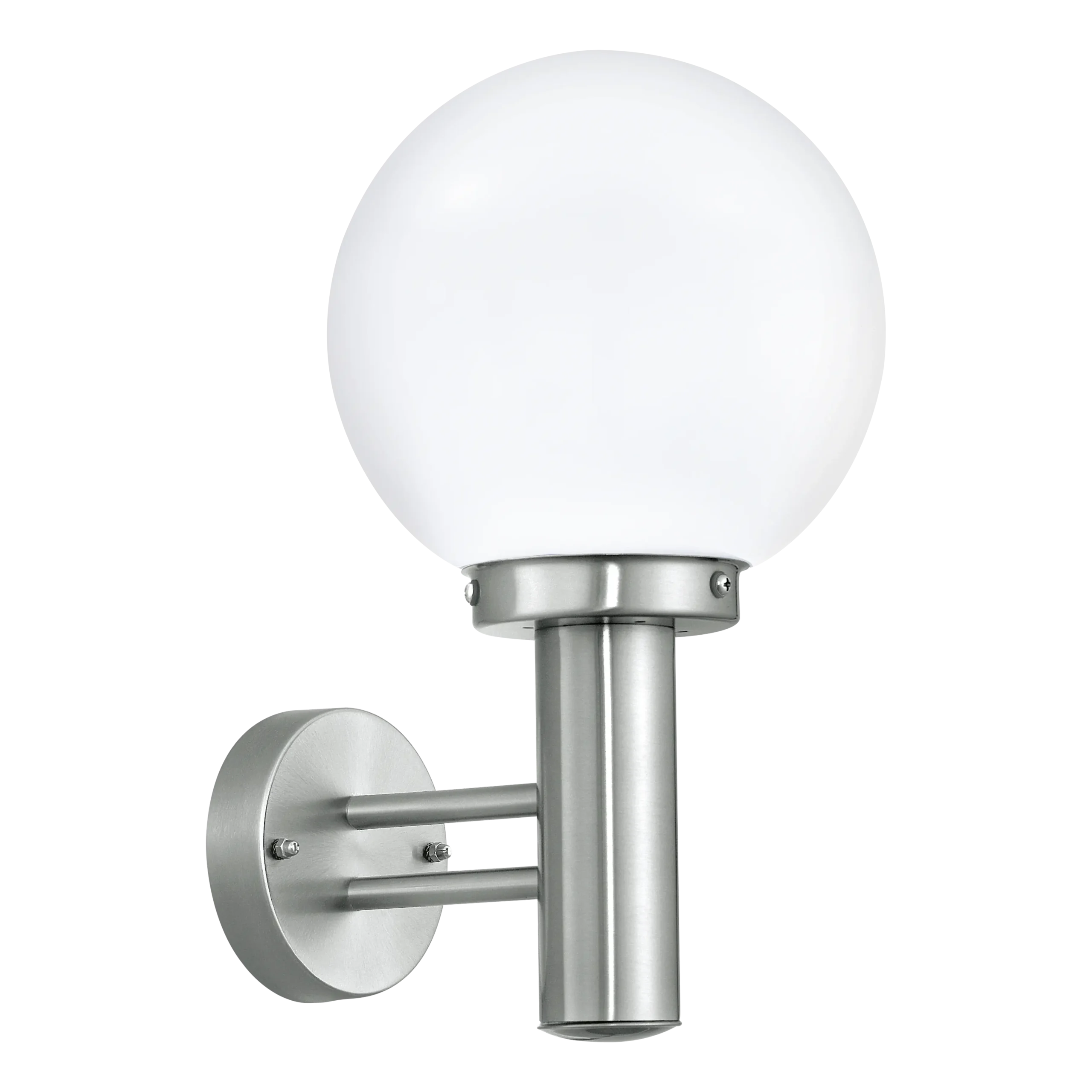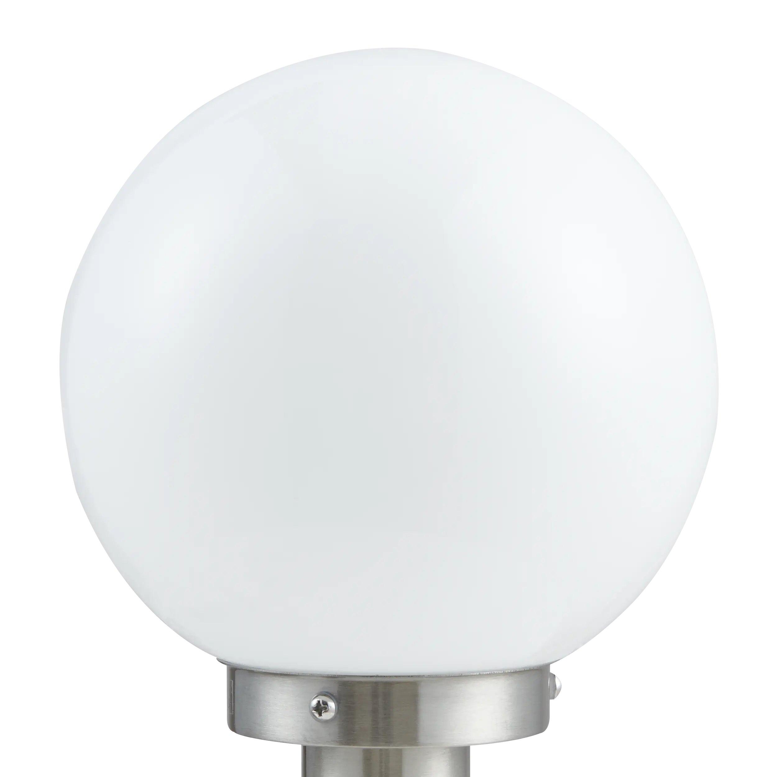 Contemporary outdoor style – Modern design featuring a satin-white glass globe atop a stainless-steel body; elegantly fits entrance ways, patios, or exterior walls.