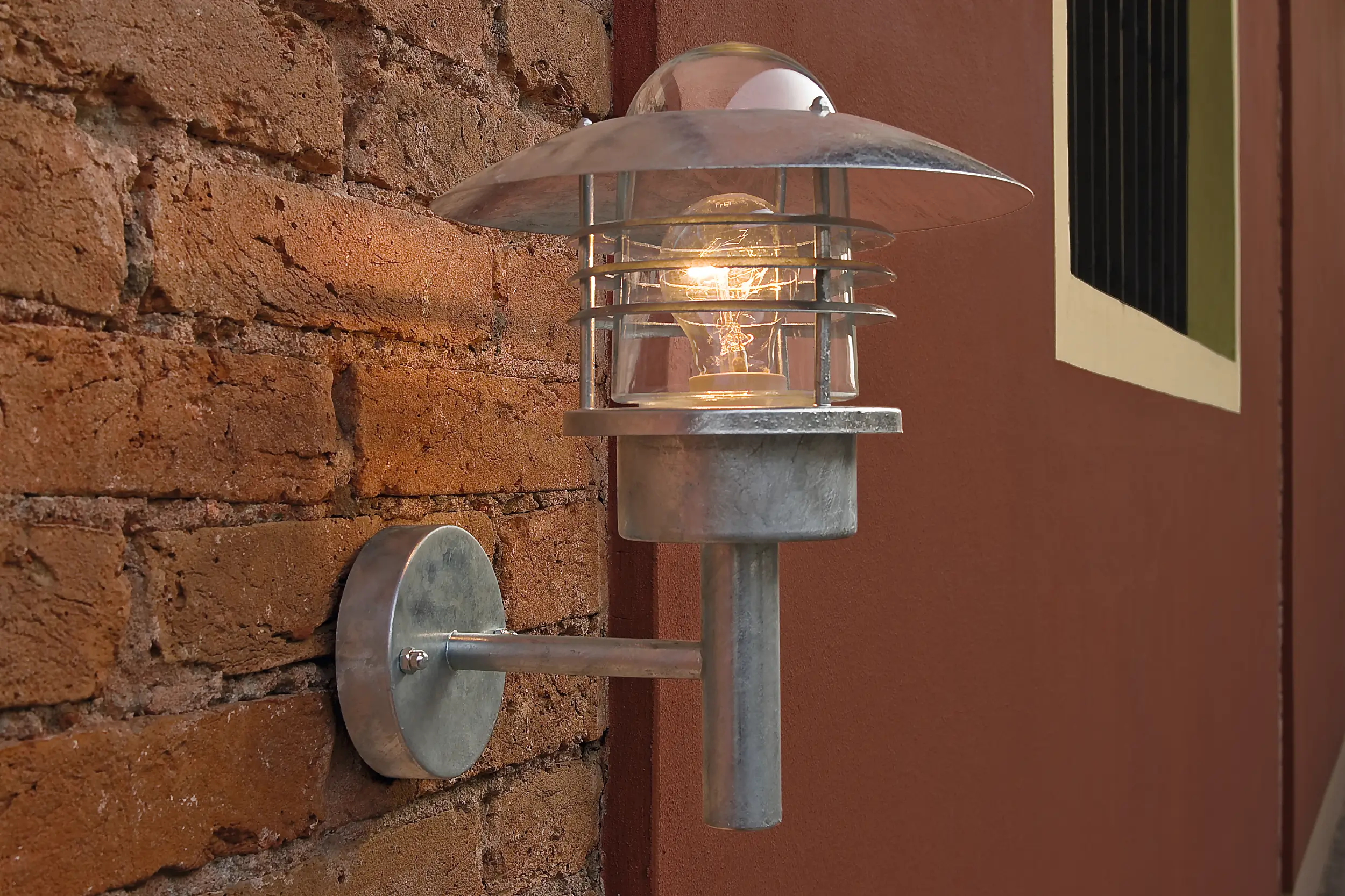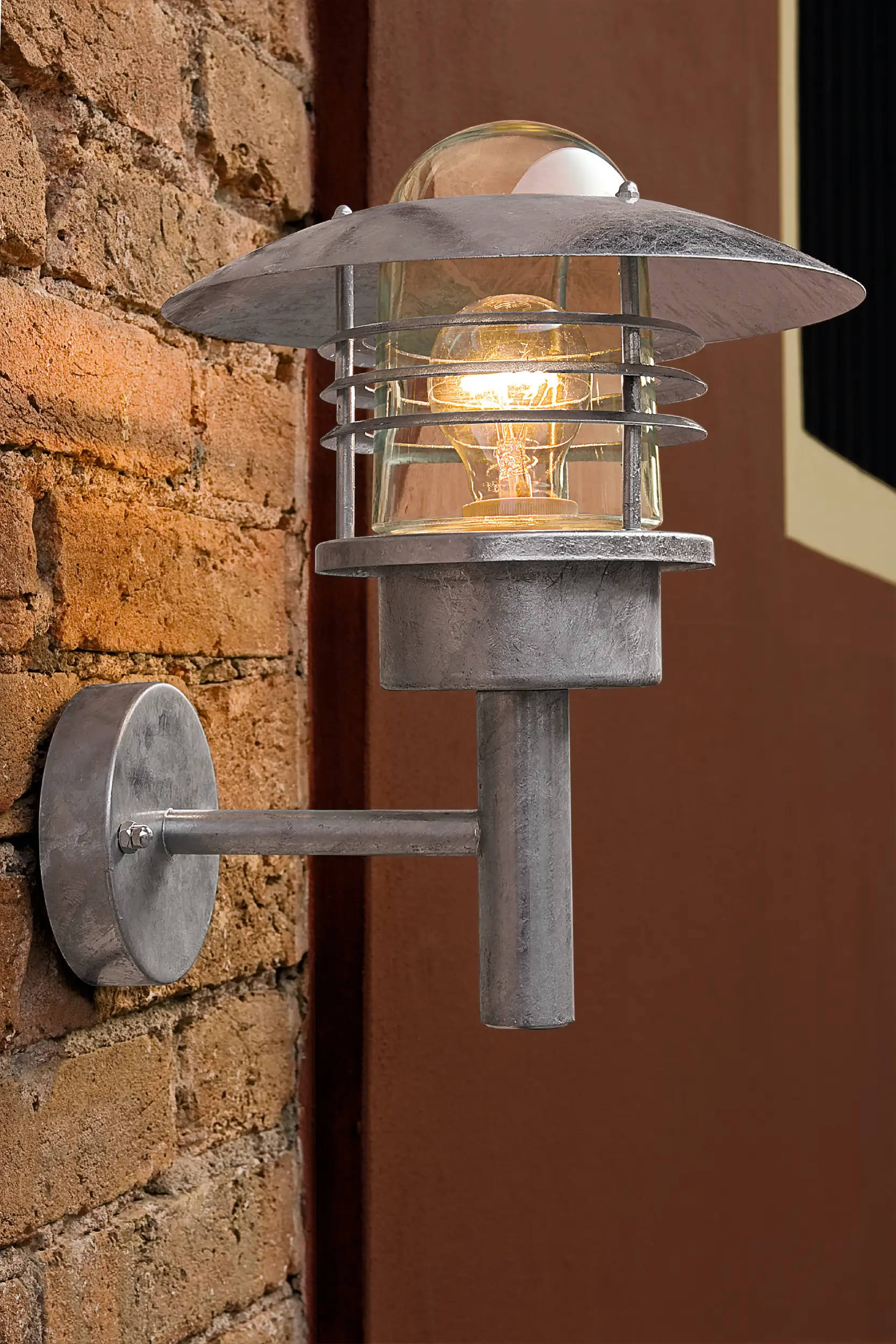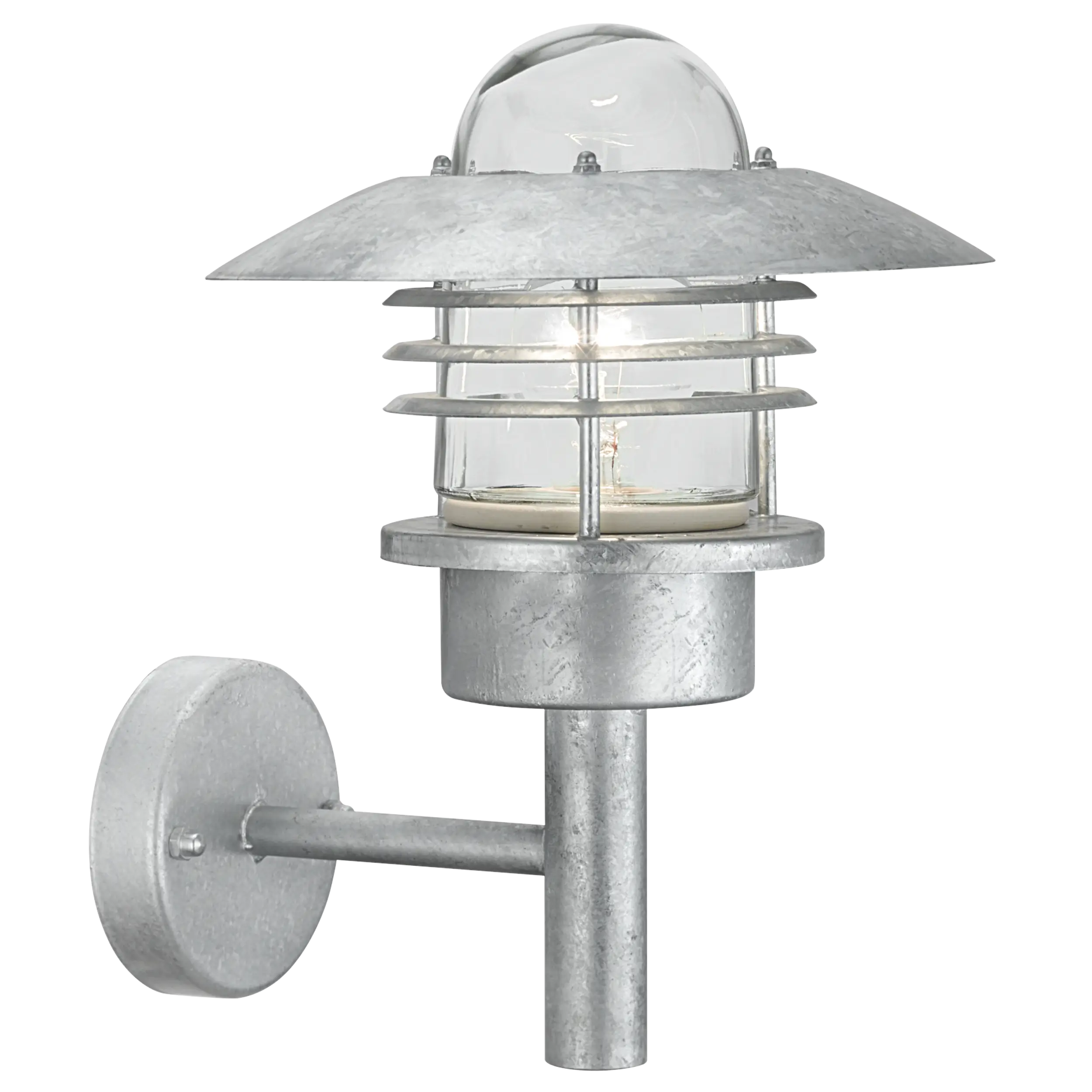 Classic outdoor wall lantern in zinc‑plated steel with clear glass, IP44 weather protection, E27 up to 60 W (lamp not included), 322×240×280 mm.